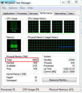 So after powering the PC on, I had a message from the BIOS that the amount of memory had changed. Thanks for picking that up BIOS – it meant that I installed it correctly. After loading Windows, I thought that I’d better check to make sure the Operating System also picked up the memory change. So I went into Computer Properties to check the amount of memory – it showed 8GB. Hurray… that was my initial thought. But then I decided to also check the task manager to see how much memory it picked up and it was 2985MB. It was one of those “WHAT THE!” moments.