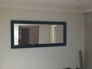 I moved on to the second anchor and then came the second problem. There was a stud and the location of where anchor was meant to go was actually on the edge of the stud. I ended not using the second anchor and just used a screw. After mounting the second screw I was ready to put the mirror on. That’s when I needed the help of my wife to hold one of the ends of the mirror so that I could mount the other end. When I got one of the ends in, I felt like I was on top of the world. I just need to get the other end in and that would have been it… but then came the third problem. For some reason, the screw was slightly off and was not positioned perfectly where the hole need to go in. So with the help from the wife I took the mirror down for assessment. I looked for the measuring tape and realised that was my problem. The metal edge of the tape was actually bent and therefore this cause the measurements to be skewed. Oh great. Lesson learnt – BUY A GOOD MEASURING TAPE.