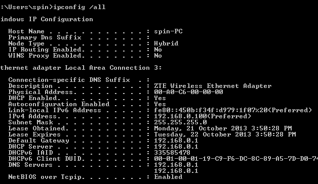 - Once it’s unlocked and set up correctly, you can then teether using the USB cable. You will receive the below IP address. it will come up as ZTE wireless ethernet adapter.