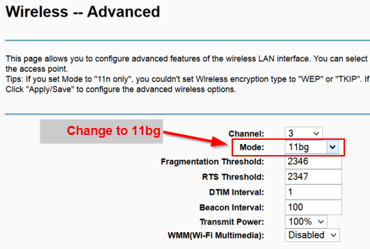 THE FIX: The setting I had to change was to select 11bg for the Mode setting. This meant I didn’t use the N protocol (higher wireless speeds) from the laptop to the router, but as I mention before, I didn’t really care as I would rather have faster Internet speeds. Here’s the setting to change: