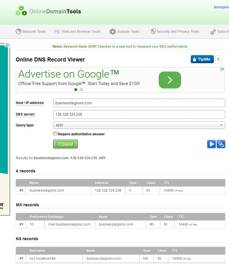 I also found out that when using VestaCP, the default SOA for all your websites is ns1.localhost.ltd. so it’s best to change your SOA to your own domain e.g ns1.businesslegion.com. (note that there is a full stop at the end)