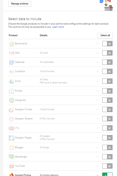 Today my wife asked me how she could download all her Google photos into her computer for backup purposes and that’s where I was stumped. It was a very good question from the wife and I admitted to her that I didn’t have the answer. After a few minutes of research I discovered that Google has a tool called Google Takeout which allows you to save your Google data (bookmarks, mail, calendar, contacts, drive, profile, hangouts, google+ circles, google+ stream, google+ pages, blogger, messenger, youtube, google photos, google play books, tasks, location history, maps, and baraza).