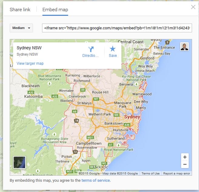 <iframe src="https://www.google.com/maps/embed?pb=!1m18!1m12!1m3!1d424396.3176723366!2d150.92243255000005!3d-33.7969235!2m3!1f0!2f0!3f0!3m2!1i1024!2i768!4f13.1!3m3!1m2!1s0x6b129838f39a743f%3A0x3017d681632a850!2sSydney+NSW!5e0!3m2!1sen!2sau!4v1431400610466" width="600" height="450" frameborder="0" style="border:0"></iframe>Below is the embedded code into this blog post