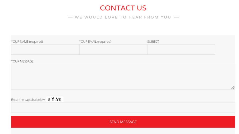 So the first step is to change the layout of the form. I wanted the Name, Your Email and Subject to be in the same row. The Your Message field and the Send button I wanted these to also be in a separate row. To do this, I ended up using the table syntax (yes I know most of you will say its best to use CSS but I didn’t have enough time to work this out so I used tables instead). Anyways, here’s the code that I used: