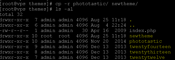 cp -r phototastic newthemeAs you can see above, the file ownership belongs to root, so we need to change the file ownership to admin. The command I used was: