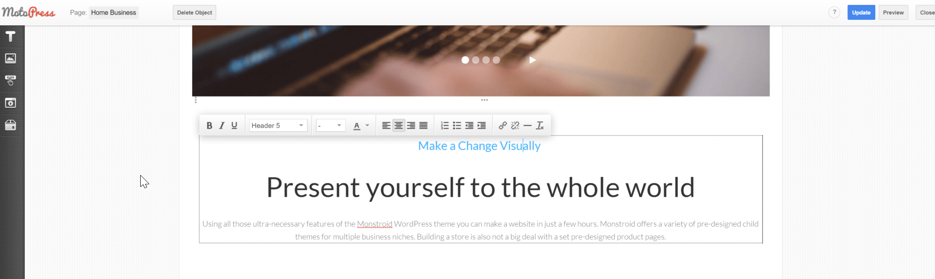 You can drag and drop elements onto the page and then make the relevant changes. This is useful if you’re not a coder or haven’t really used WordPress before. As an example on the homepage I changed one of the headings to Make a Change Visually by simply clicking on the area and then replacing the text. Make sure to hit publish.