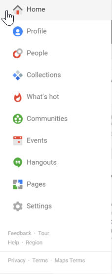 Today, I needed to go into my Google+ Photos to retrieve an old photo I took earlier this year. When I went into Google+ I couldn’t find the Photos button which is generally located somewhere on this list: