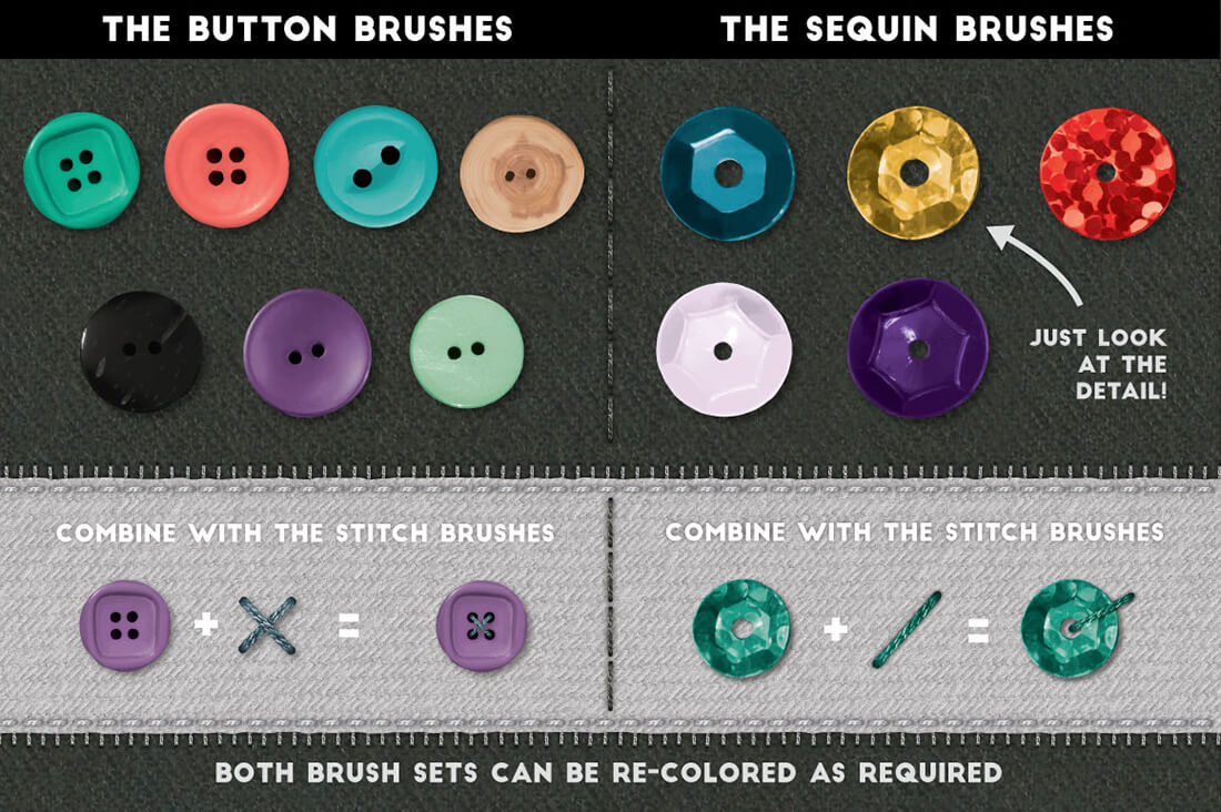 - 12 realistic stitch brushes – just like drawing with a needle and thread.
