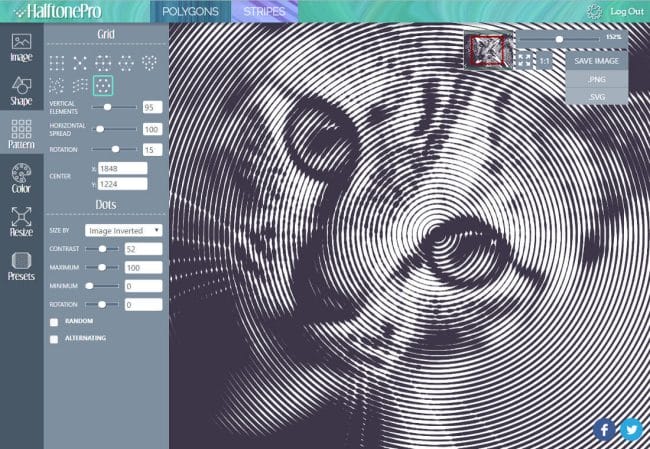 HalftonePro is a powerful and easy-to-use tool for creating vector halftone, low poly, or stripe patterns. You can use an existing image as the source or create your own gradient. Play around to customize a pattern as you see fit and then export it for use in programs like Adobe Illustrator, GIMP or Inkscape.