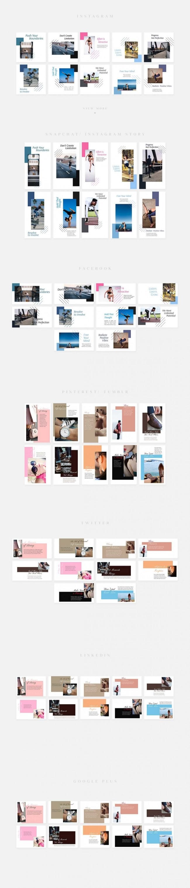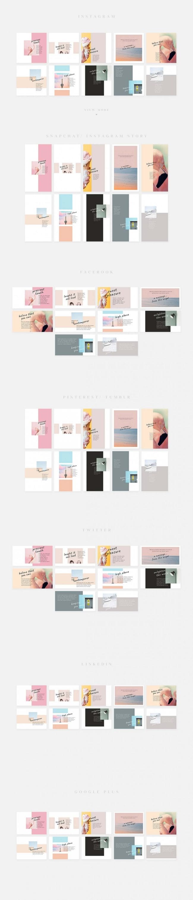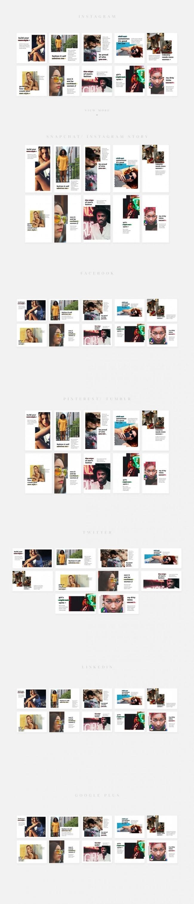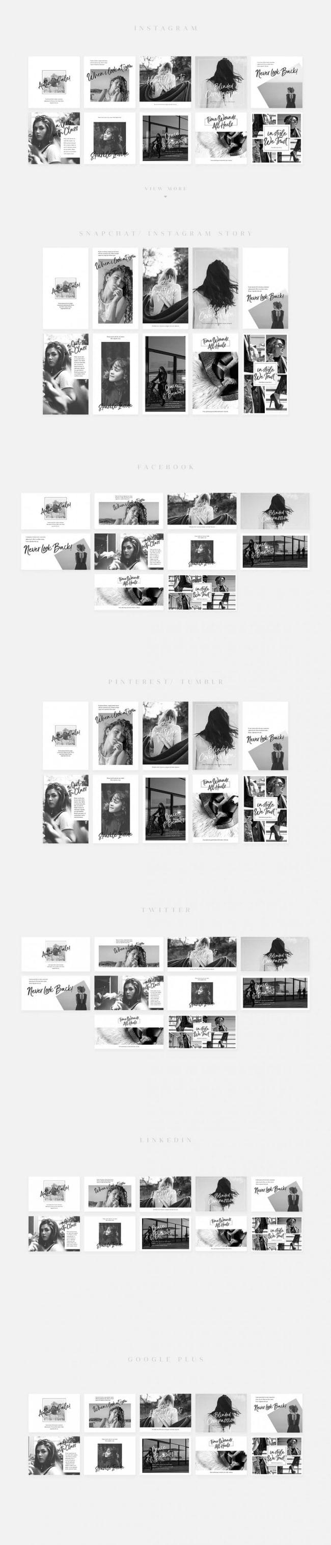 - Covers the most popular social media networks today: Facebook, Instagram, Instagram Stories, Snapchat Stories, Pinterest, Twitter, Tumblr, Linked In, Google+.
