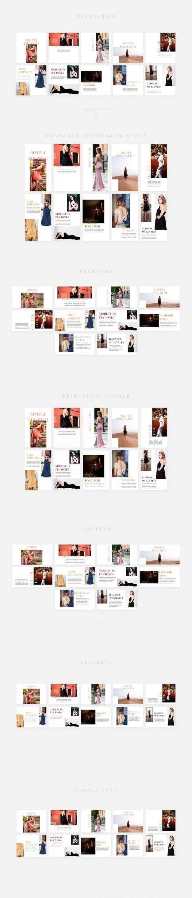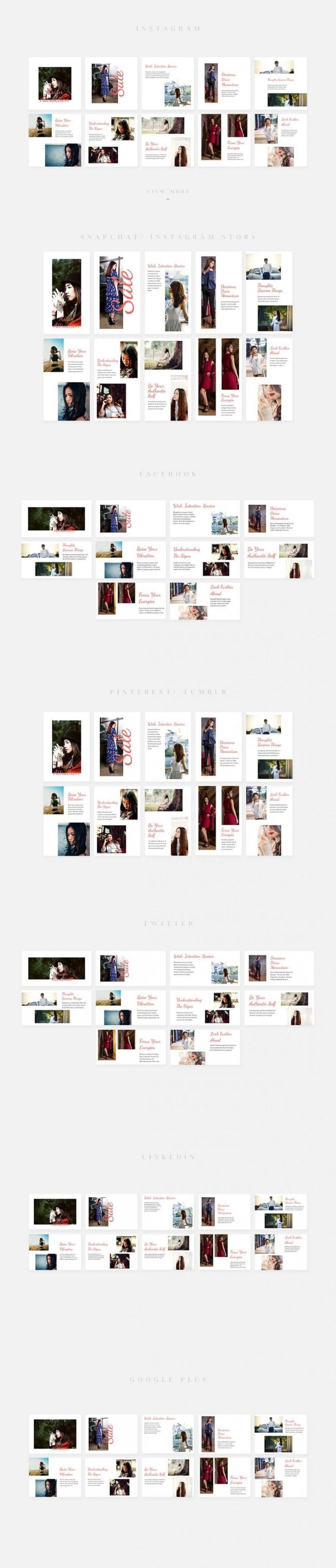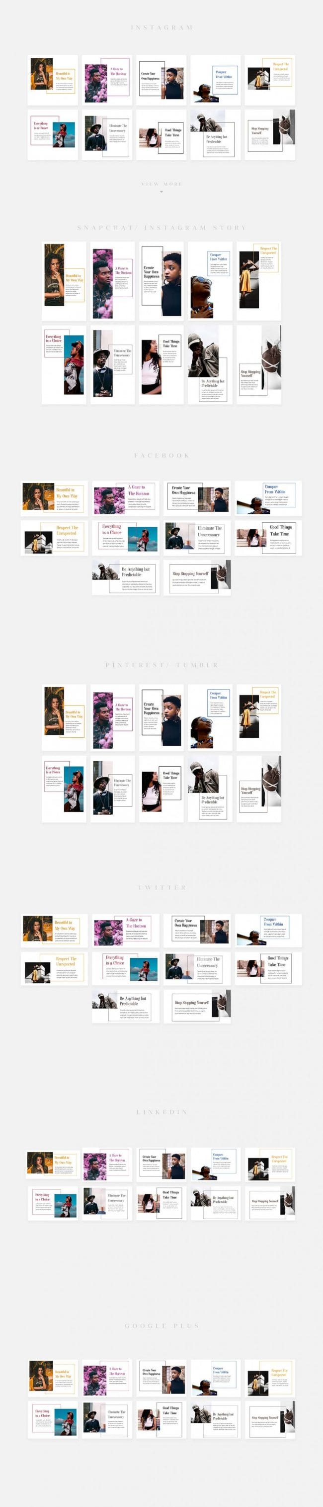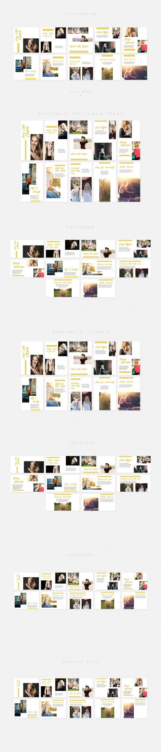 - Covers the most popular social media networks today: Facebook, Instagram, Instagram Stories, Snapchat Stories, Pinterest, Twitter, Tumblr, Linked In, Google+.