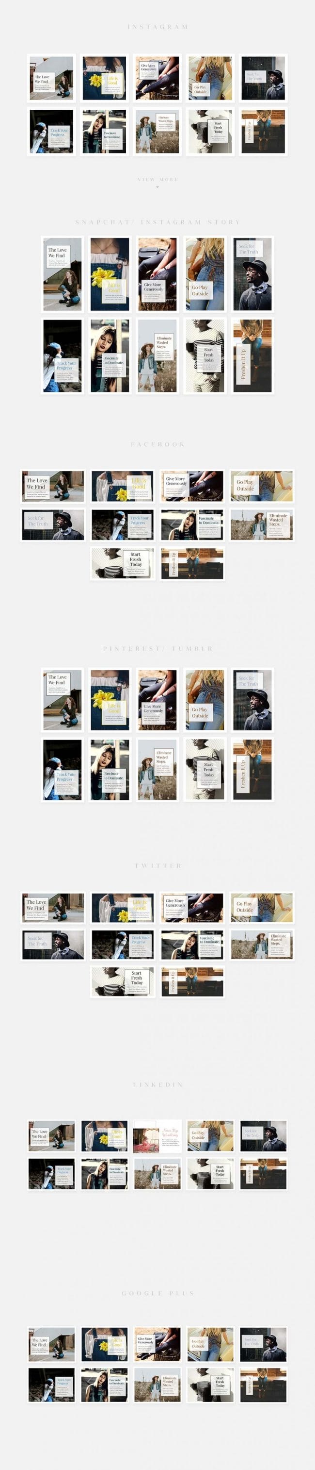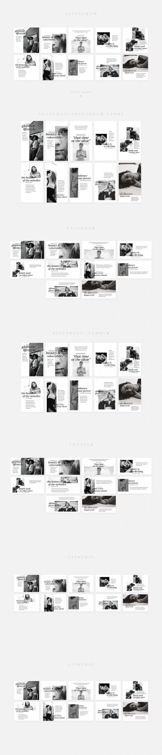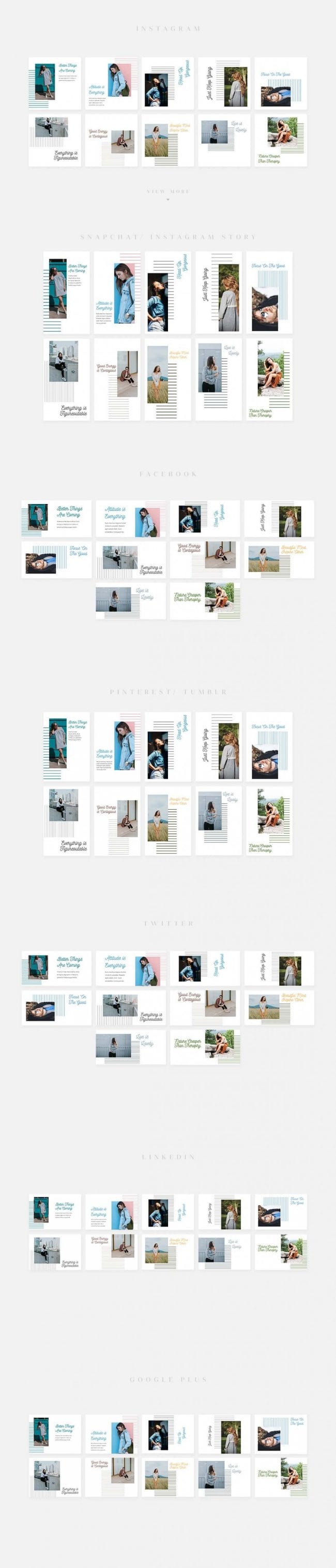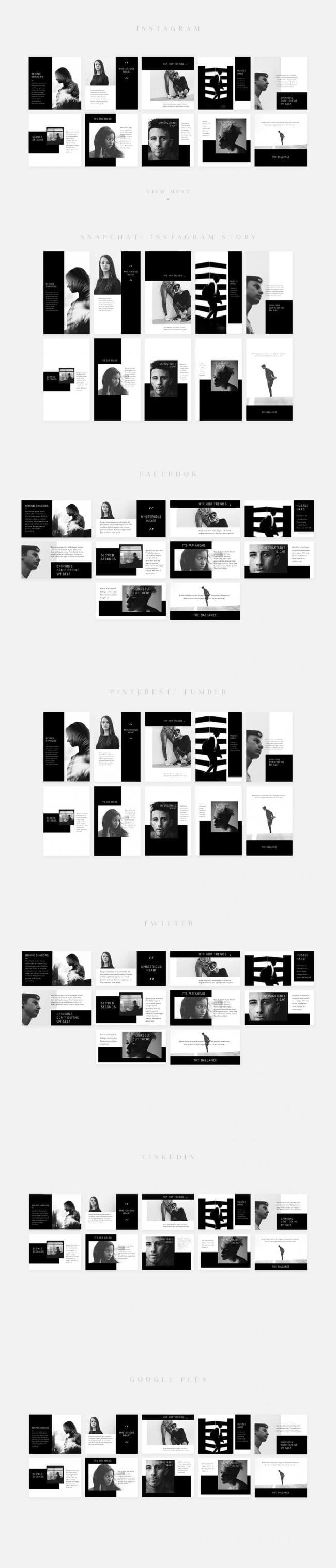 - Covers the most popular social media networks today: Facebook, Instagram, Instagram Stories, Snapchat Stories, Pinterest, Twitter, Tumblr, Linked In, Google+.
