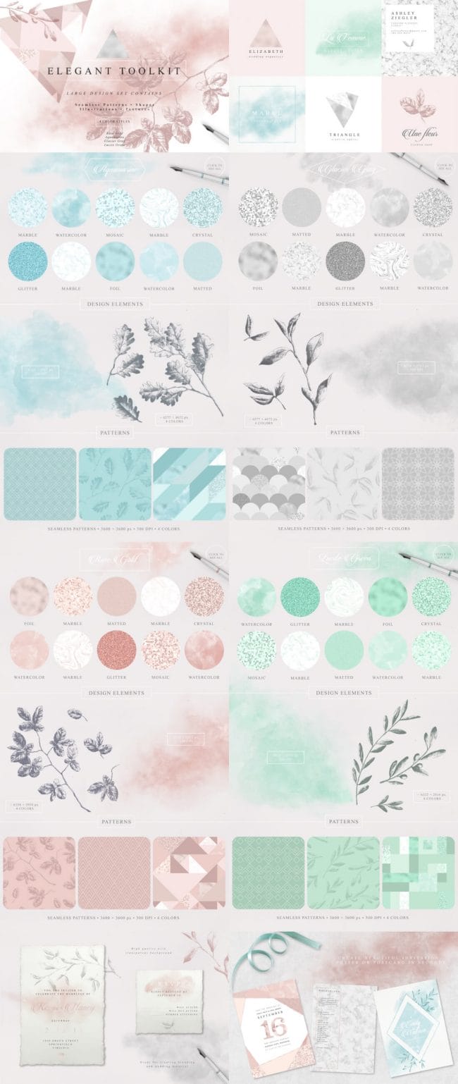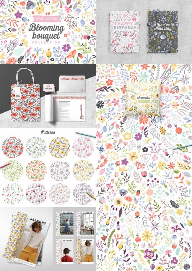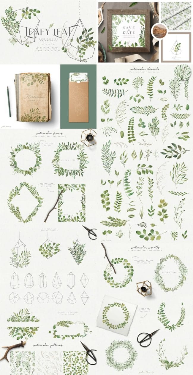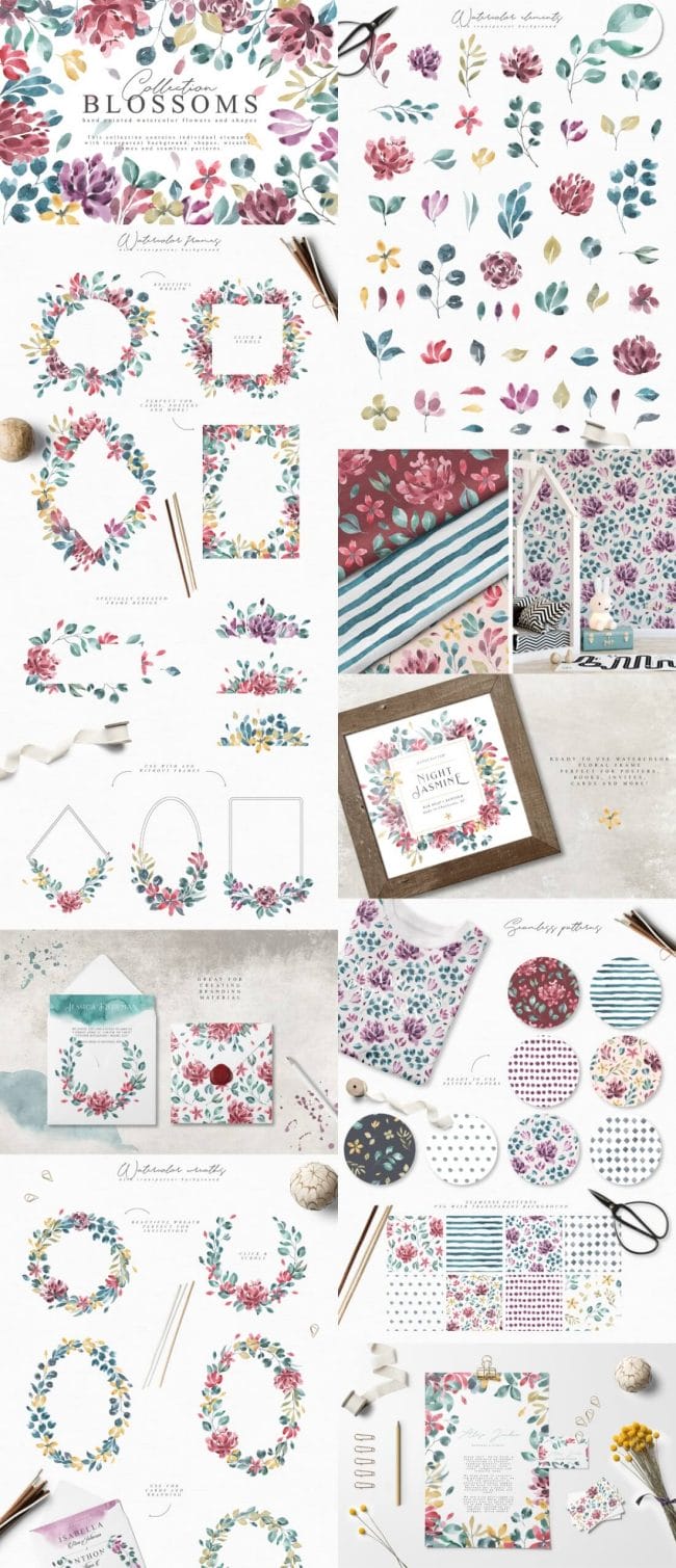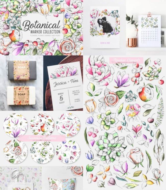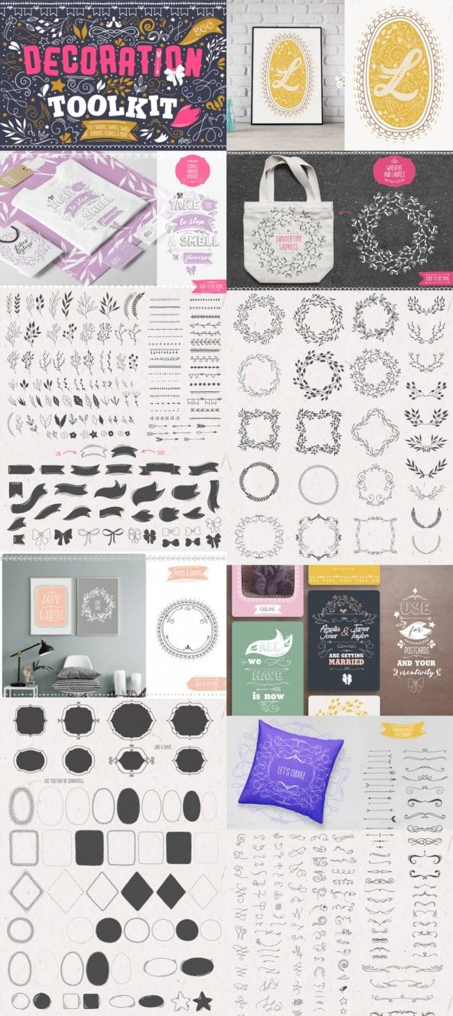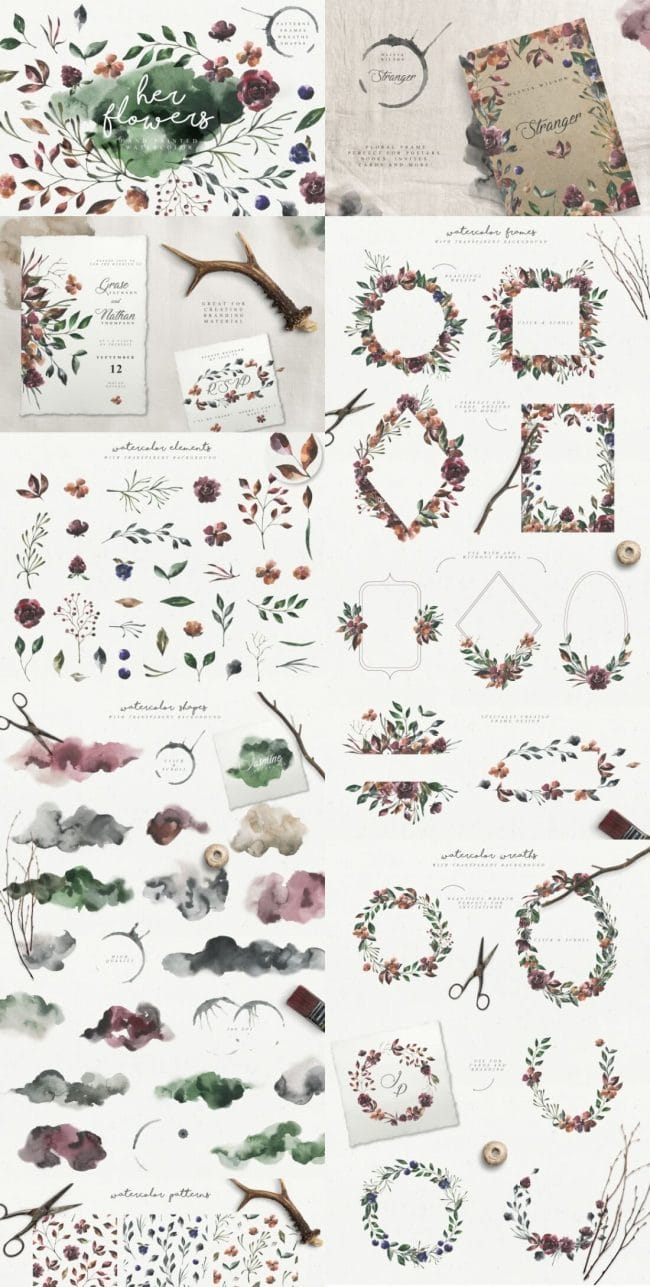 - Loads of different types – illustrations, watercolors, textures, fonts, patterns, toolkits, objects and oodles more.