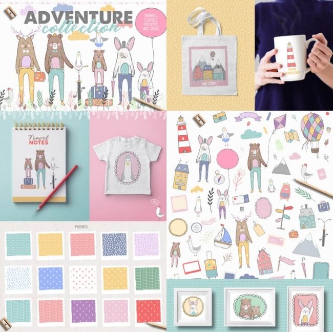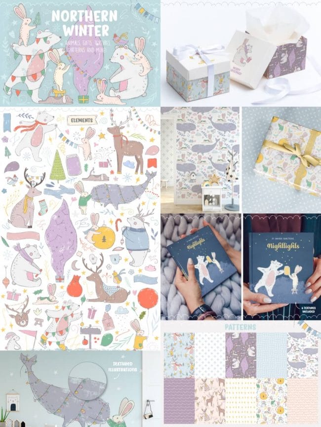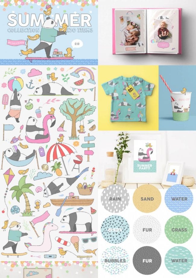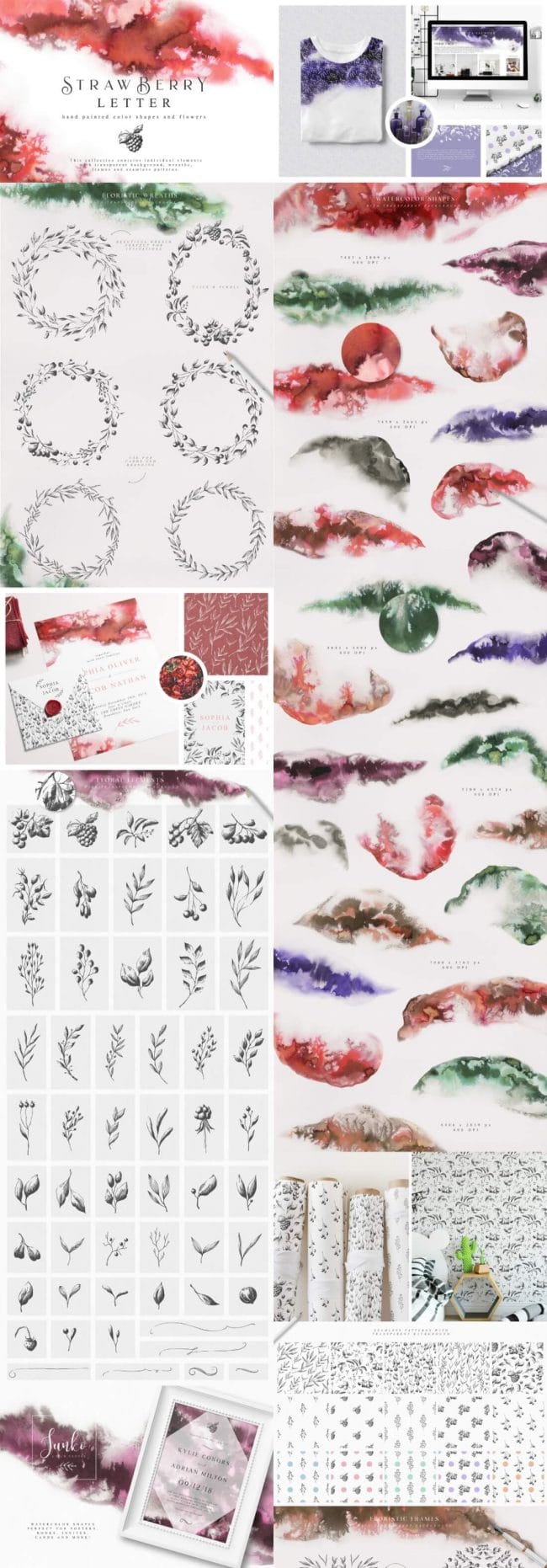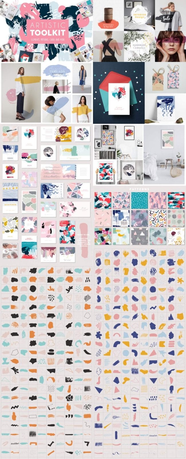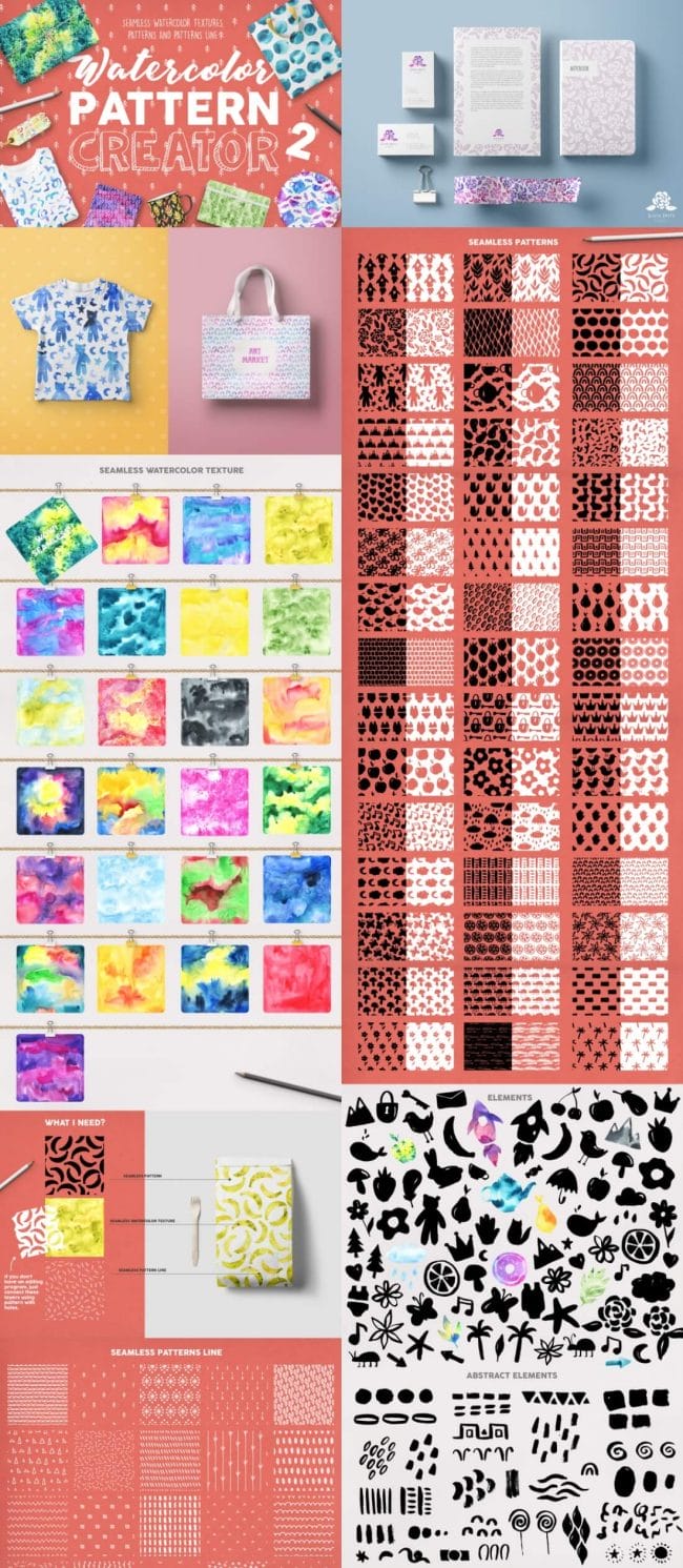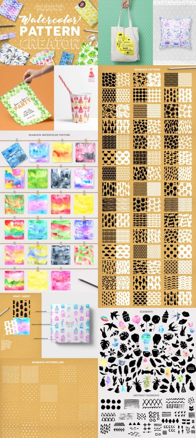 - Loads of different types – illustrations, watercolors, textures, fonts, patterns, toolkits, objects and oodles more.