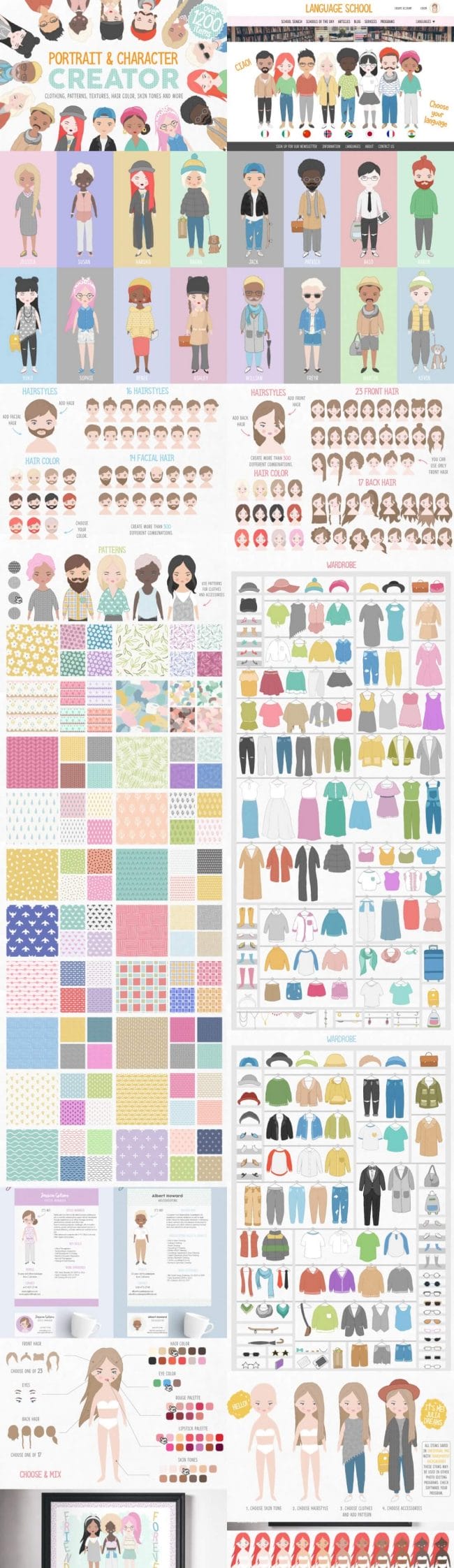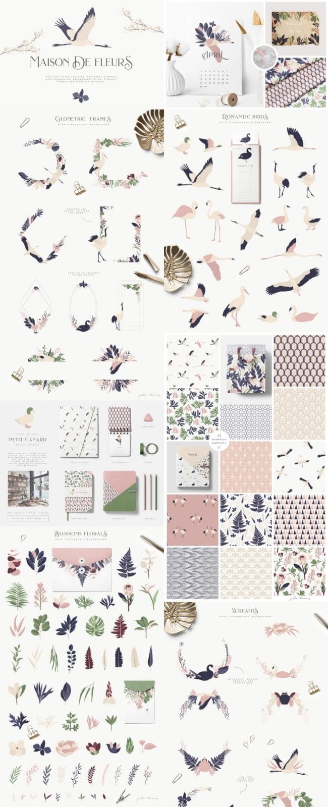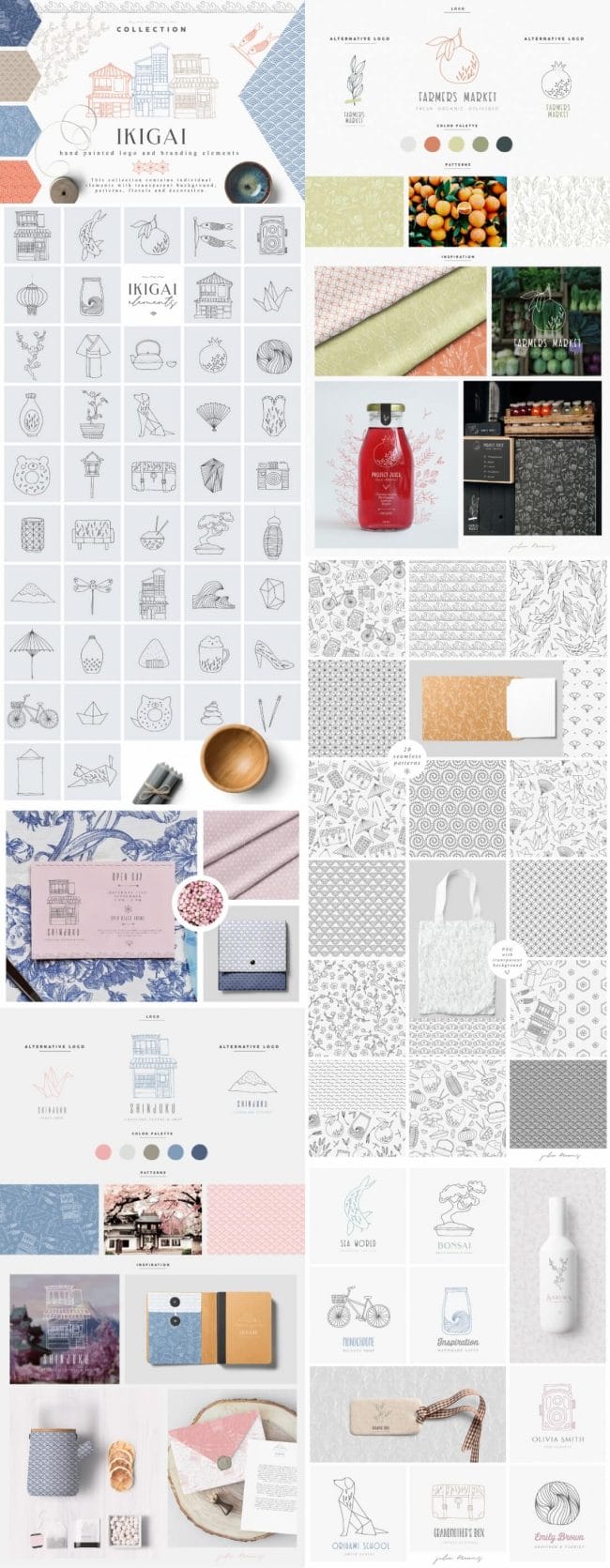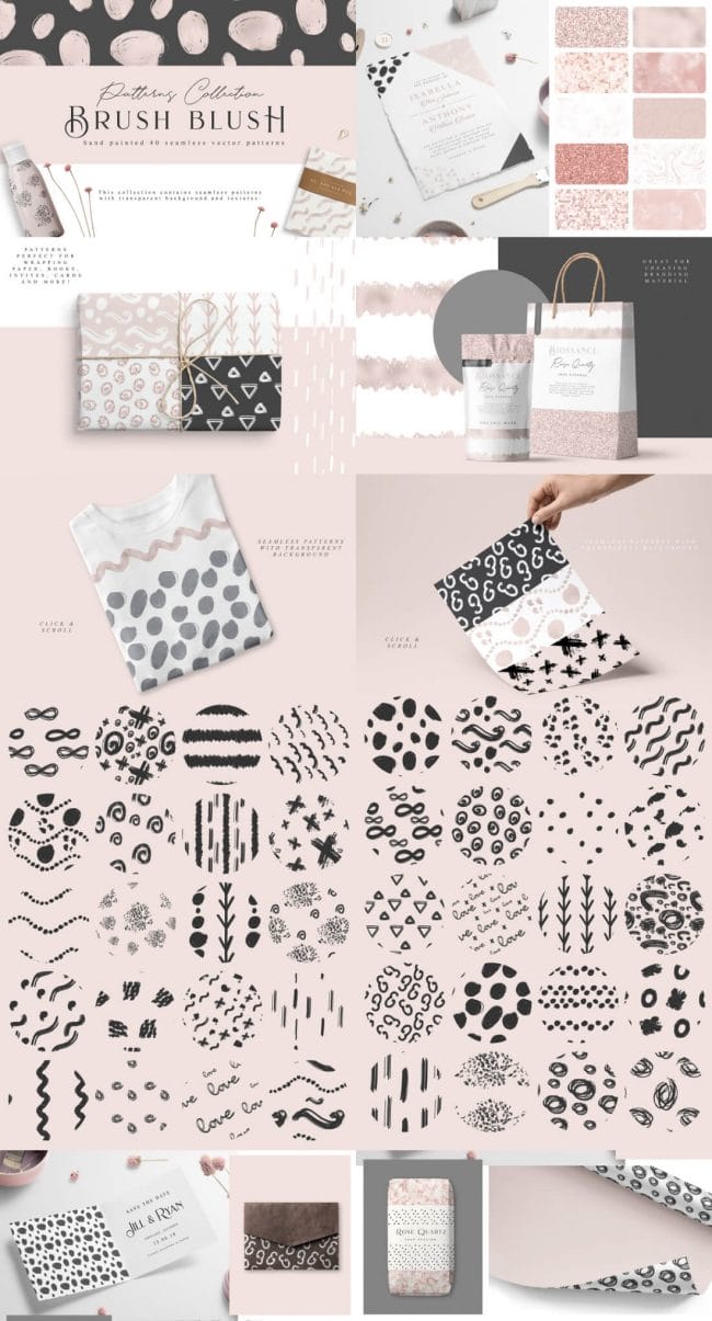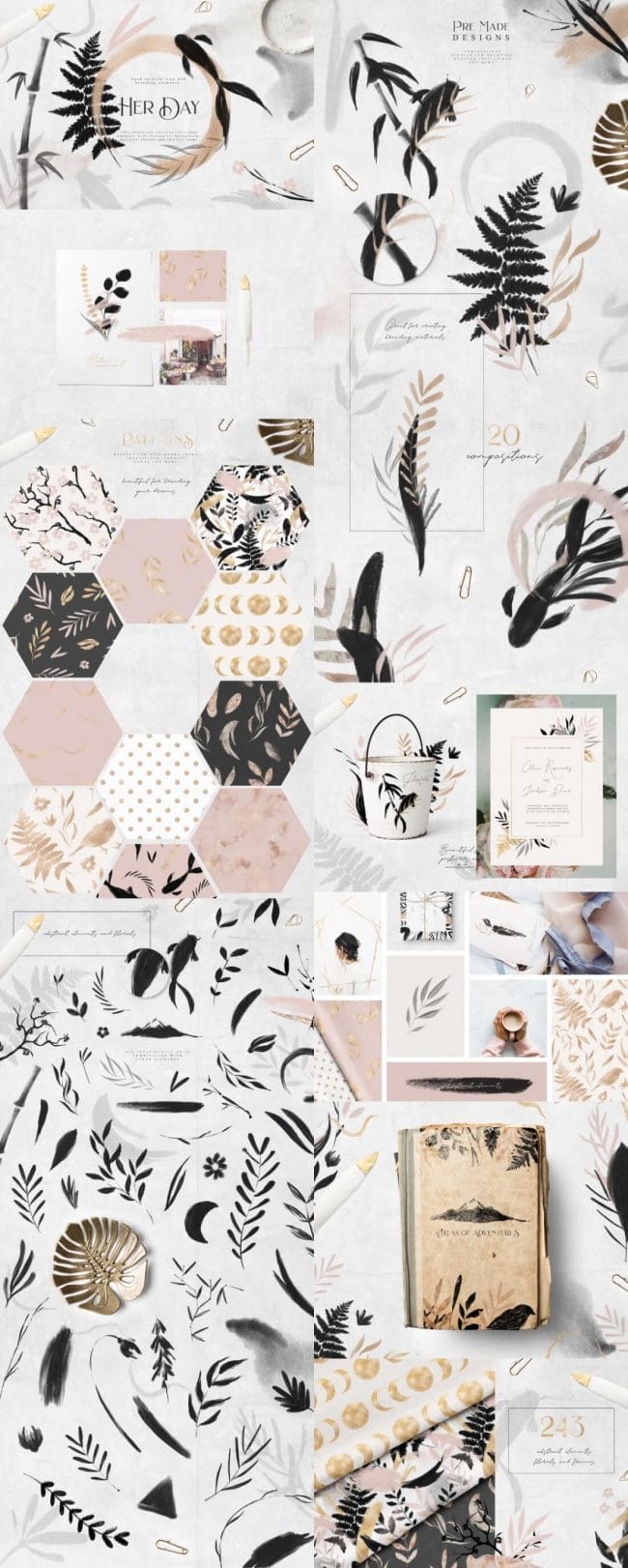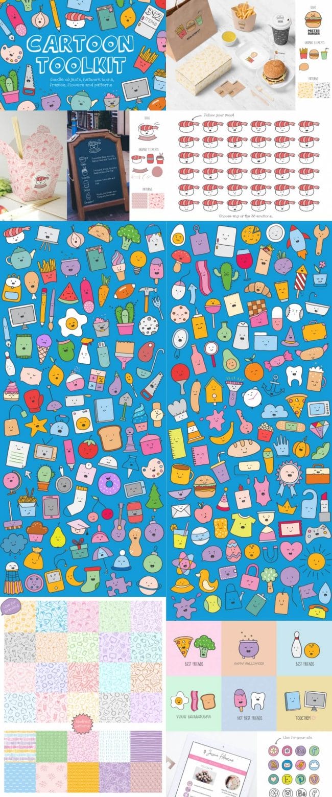 - Loads of different types – illustrations, watercolors, textures, fonts, patterns, toolkits, objects and oodles more.