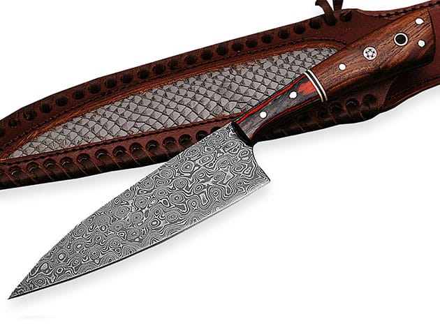 Kitchen knives must be first and foremost a formidable tool, possessing very specific attributes that endow them with the ability to process food properly. This one-of-a-kind Damascus chef knife is superior, and refined, allowing you to slice, dice, chop, and skin with absolute ease — and the stunning pakka and rose wood handle detailing will make this knife a gorgeous addition to your kitchen.