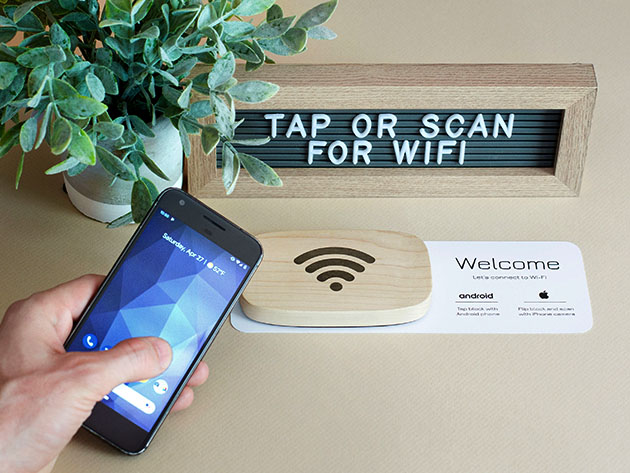 Everyone hates long passwords, but you’d hate them a lot less if you never had to type them. Wifi Porter simplifies it all to a simple tap or camera scan. This wooden puck is embedded with NFC chip so you and your guests can simply tap to connect both your Android and iOS smartphones. Getting connected has never been easier! Tap the block to connect your Android phone or flip the porter and scan the QR code with your iPhone camera.