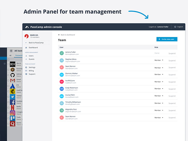 Most other password managers were built with the focus on individual users and only had teams functionality added on top of that. With PassCamp, it’s different. From the very first day, the focus was easy and efficient password management in teams. PassCamp password manager features zero-knowledge proof, end-to-end encryption and other security technologies that help you to safely keep and share sensitive information. With password storage, login autofill, password generator, secure password sharing, history log, admin console, user roles, unlimited guests, and more functions, PassCamp is a game-changing cloud-based password manager for teams and enterprises.