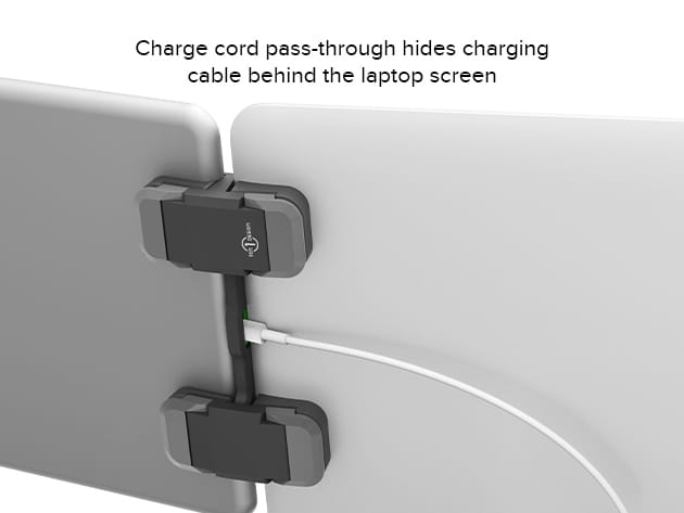 Facetime, sports, multiple displays, Netflix, chat, or whatever you need. Mountie+ frees up your desktop space for anything, everything, or nothing at all. Each enhanced for incredible stability, these grips are contoured to grip hardest near the edge of the device, avoiding undue pressure on the screen. It also facilitates charging thanks to the all-new charge cord pass-through, which redirects your charging cord behind the laptop’s screen and out of your way. Mountie+ was designed for and heavily tested on any device between 5mm and 9mm.