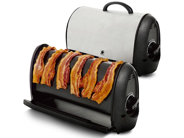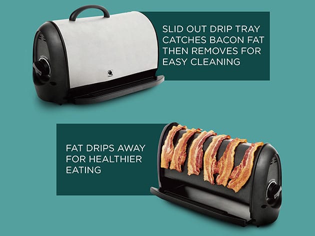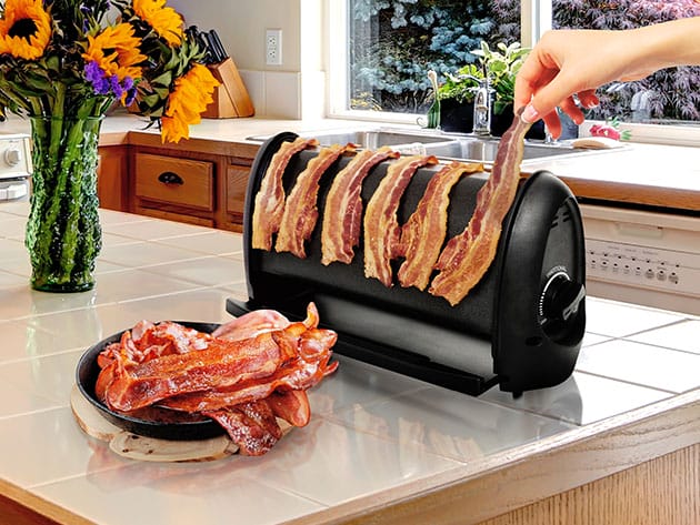 - Slow cooks bacon to a perfect crisp; laid vertically on a non-stick surface