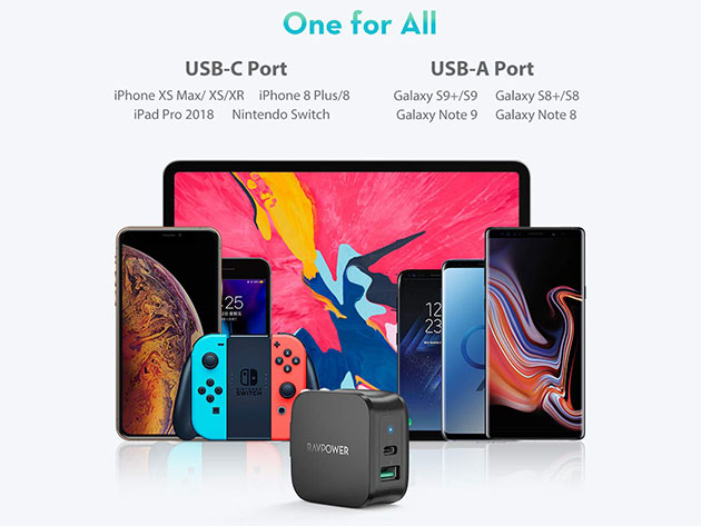 Experience safe and reliable charging with RAVPower’s 18W PD 2-Port USB-C Wall Charger. Equipped with one USB-C port and one USB-A port, this charger lets you power up both your Apple and Android smartphones. It delivers quick charging which saves you up to 2 hours of having your device plugged in. Small, lightweight, and convenient, you can carry and use this charger literally anywhere. It also comes with foldable pins to prevent damage. This dual-port charger is also packed with multi-charging protection so you won’t have to worry about over-voltage, over-heating, short-circuiting, and more.