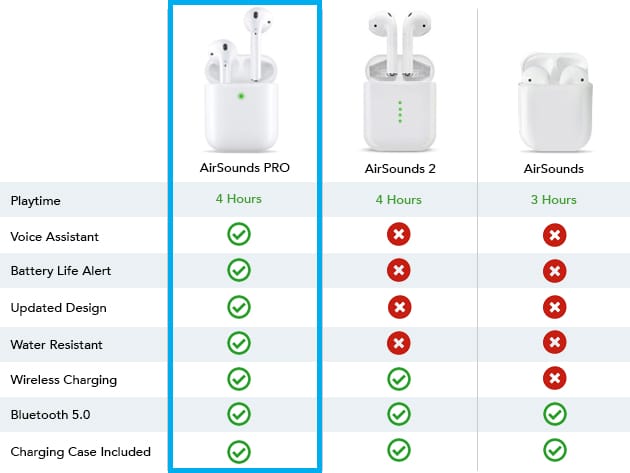 Here’s an upgrade to get excited about! The newest version of the best-selling AirSounds Earbuds are the most advanced yet, and still come at an unbeatable price point. Featuring top-notch sound quality, wireless charging, and advanced Bluetooth 5.0 technology, the AirSounds Pro have everything you love about the AirSounds 2 and more! Think a new and improved design, seamless connectivity, and battery life status updates every time you connect. Simply pair with your device of choice, and a pop-up window will appear notifying you of your remaining battery life. Of course AirSounds Pro still packs all the features you’ve come to expect in a pair of true wireless earbuds, like auto-pairing and touch controls. Ready to upgrade your audio gear? Don’t miss out on the new and improved AirSounds Pro!
