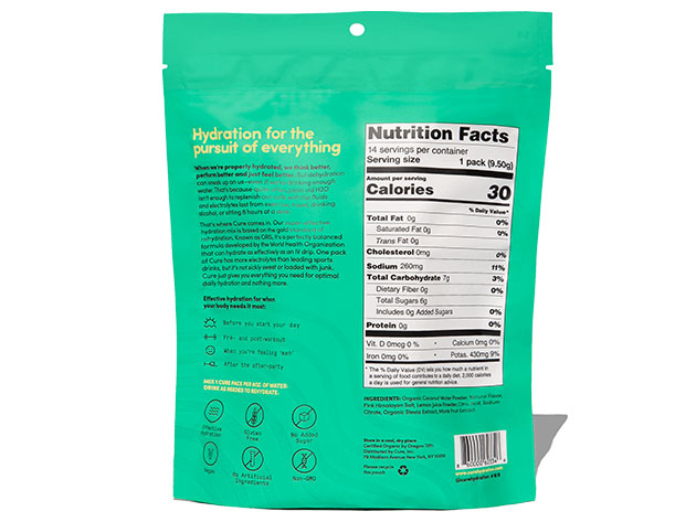 Most of us are suffering from chronic dehydration without even realizing it. Proper hydration can help you stay focused and alert. Cure Hydration is an organic hydration drink mix based on the World Health Organization standard for Oral Rehydration Solution (ORS) but updated for a modern lifestyle. The formula has 4x the electrolytes of leading sports drinks but contains no added sugar or artificial ingredients. This scientifically balanced formula can be used to help combat dehydration caused by everyday activities including exercise, travel and drinking alcohol. drink Cure to recover from exercise, ward off a hangover, or just to keep your immune system healthy.