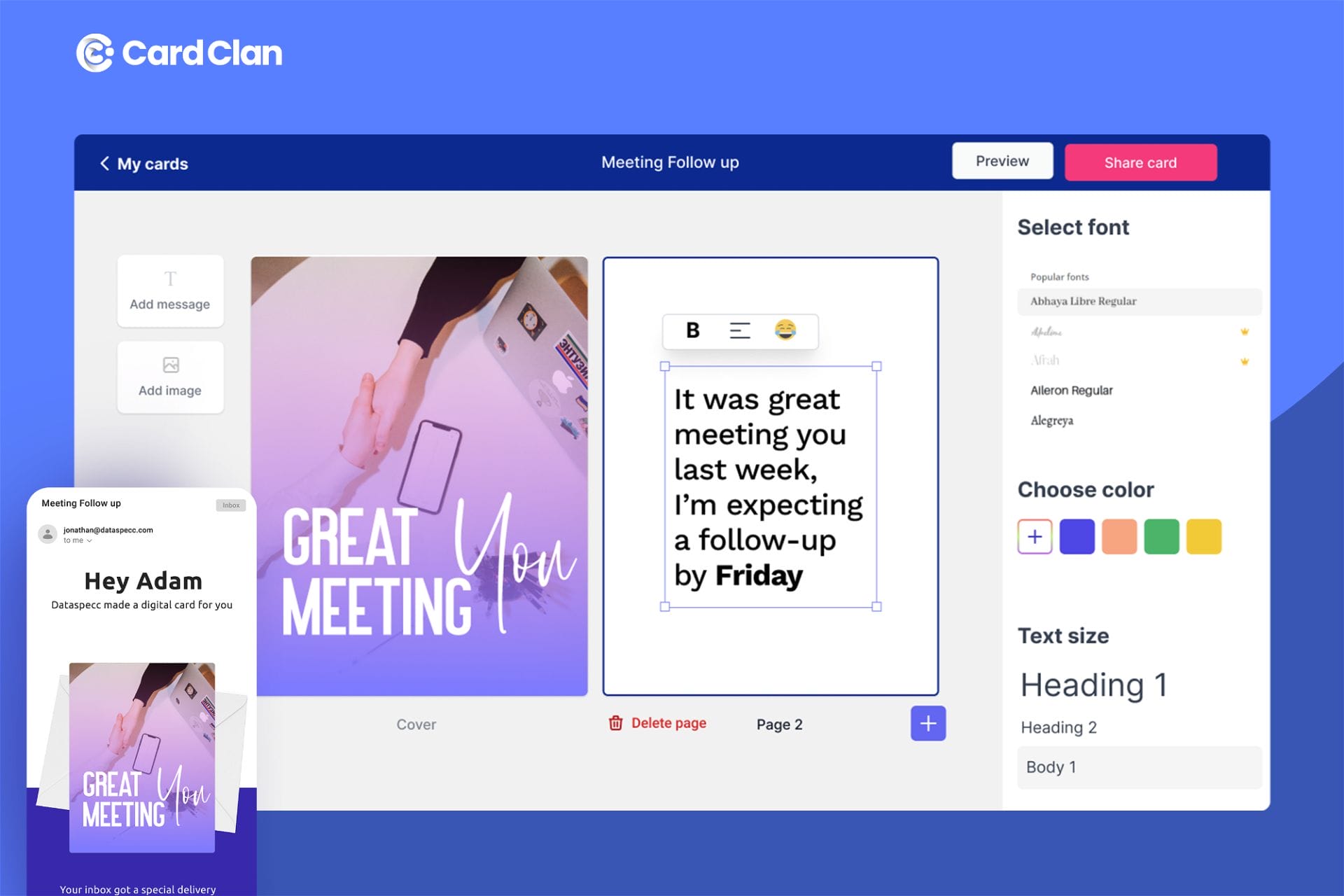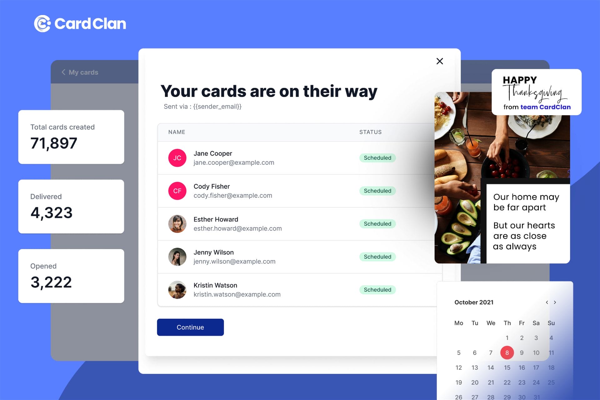 CardClan lets you make meaningful connections with your customers, colleagues, and community members with personalized digital cards delivered right to their inbox.