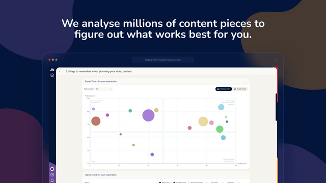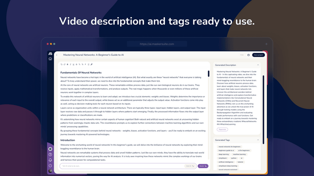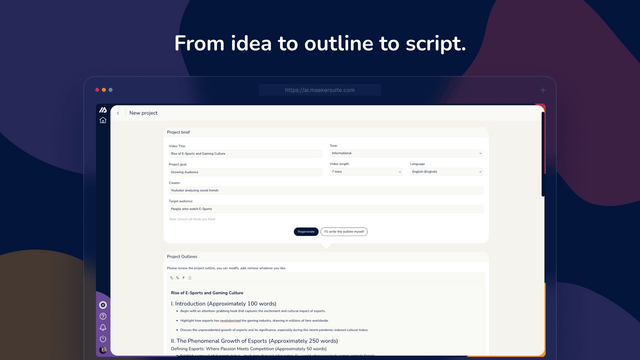 Maekersuite is an AI-powered video platform that analyzes millions of YouTube videos to create SEO-friendly scripts in 15 minutes.