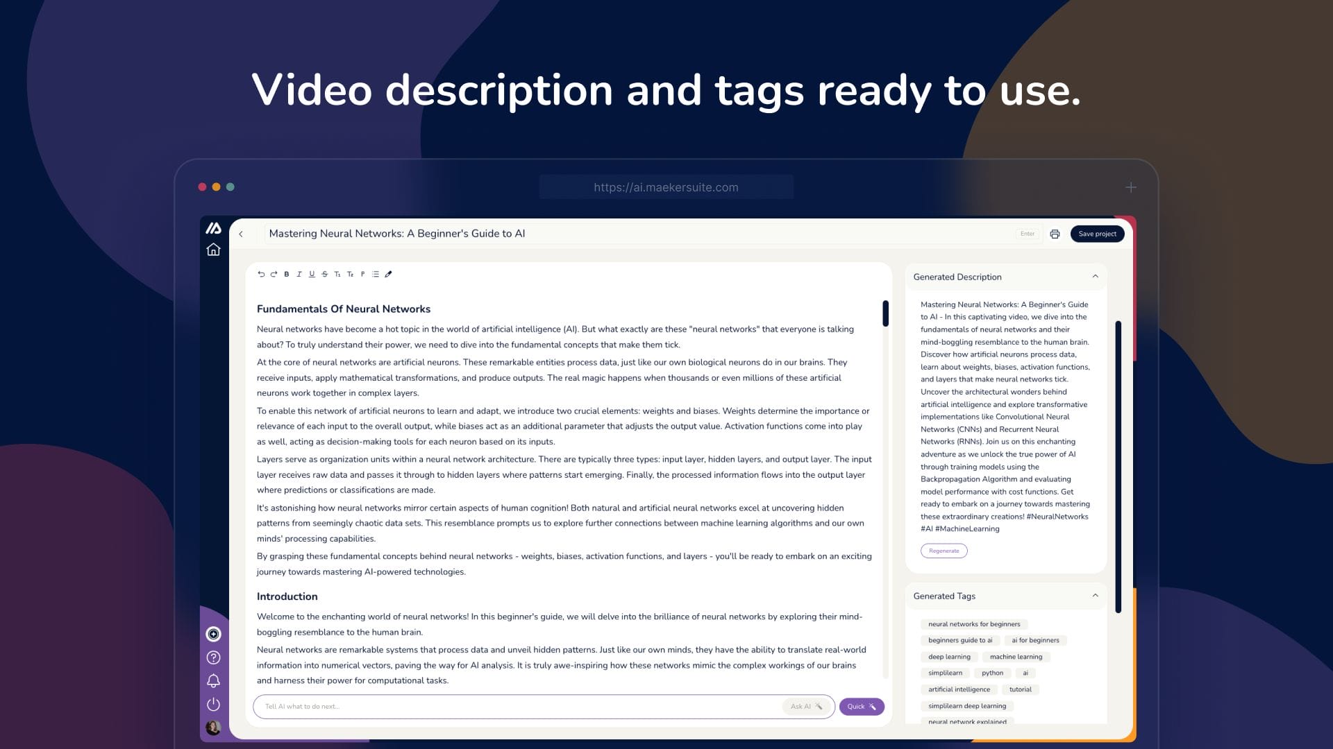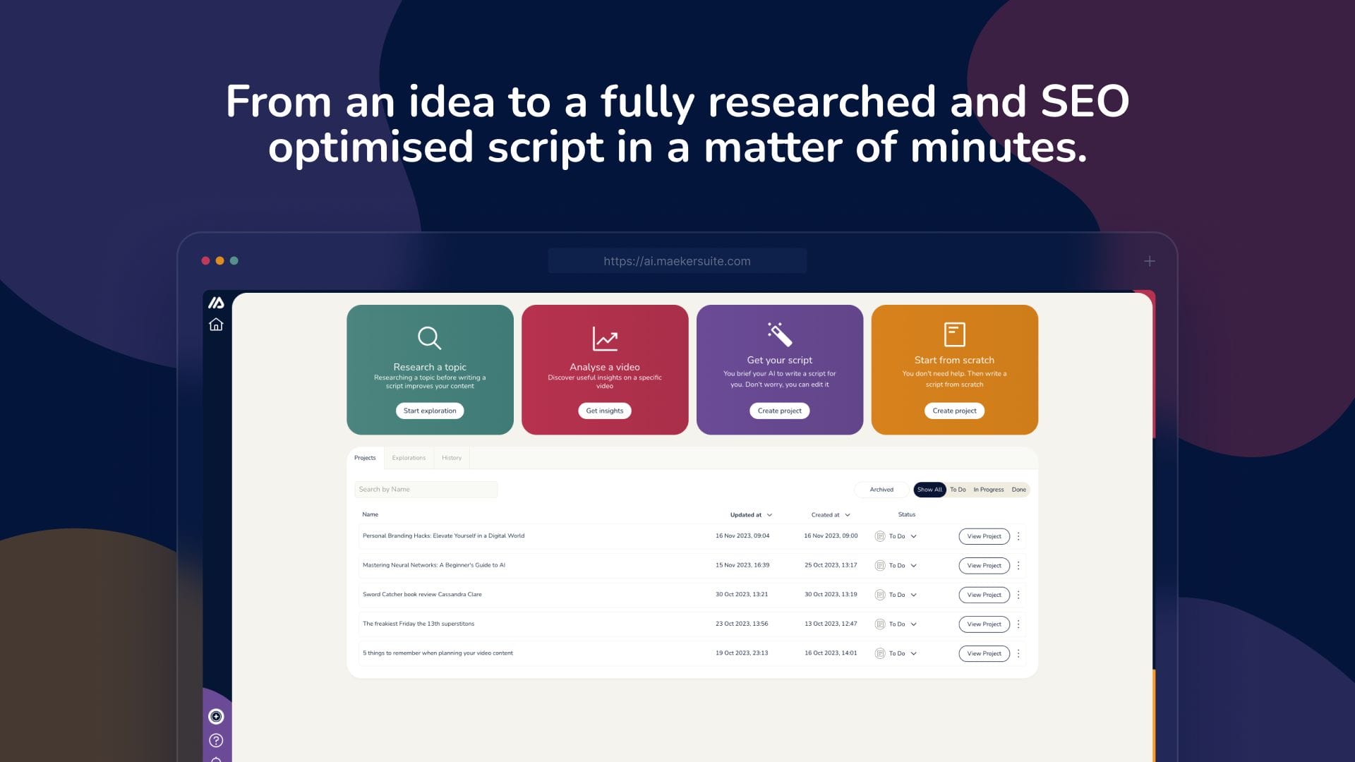 Maekersuite is an AI-powered video platform that analyzes millions of YouTube videos to create SEO-friendly scripts in 15 minutes.