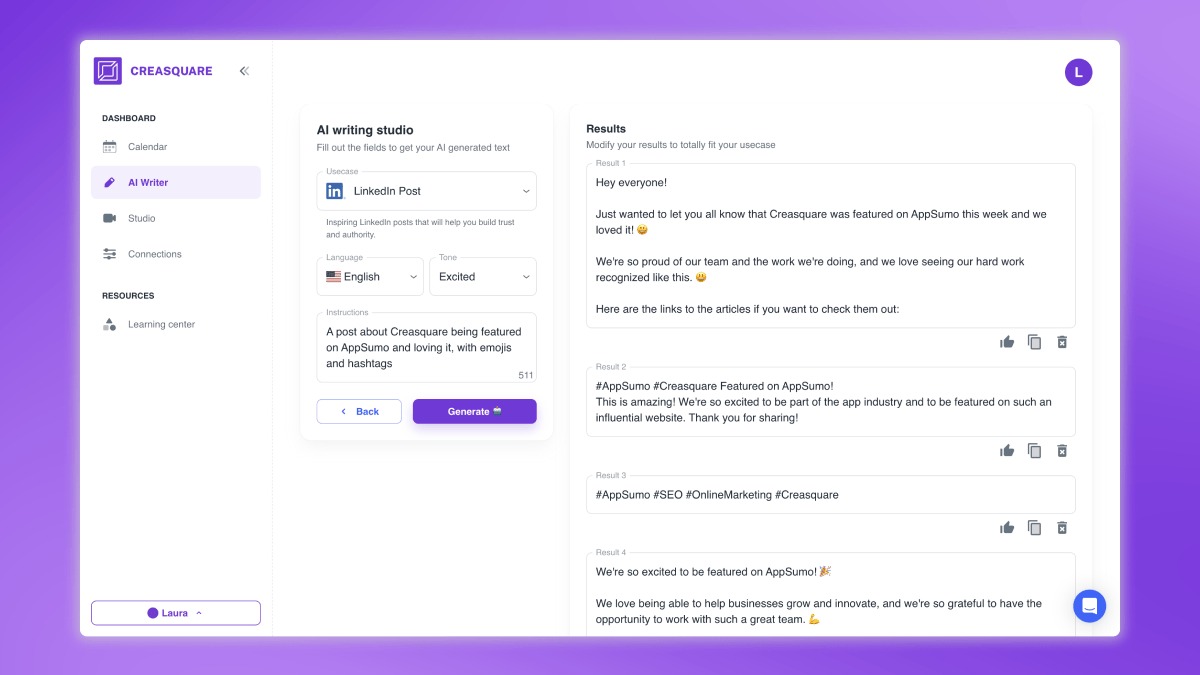 Creasquare is an AI-powered software that makes it easy to create and schedule content across all your social media platforms.
