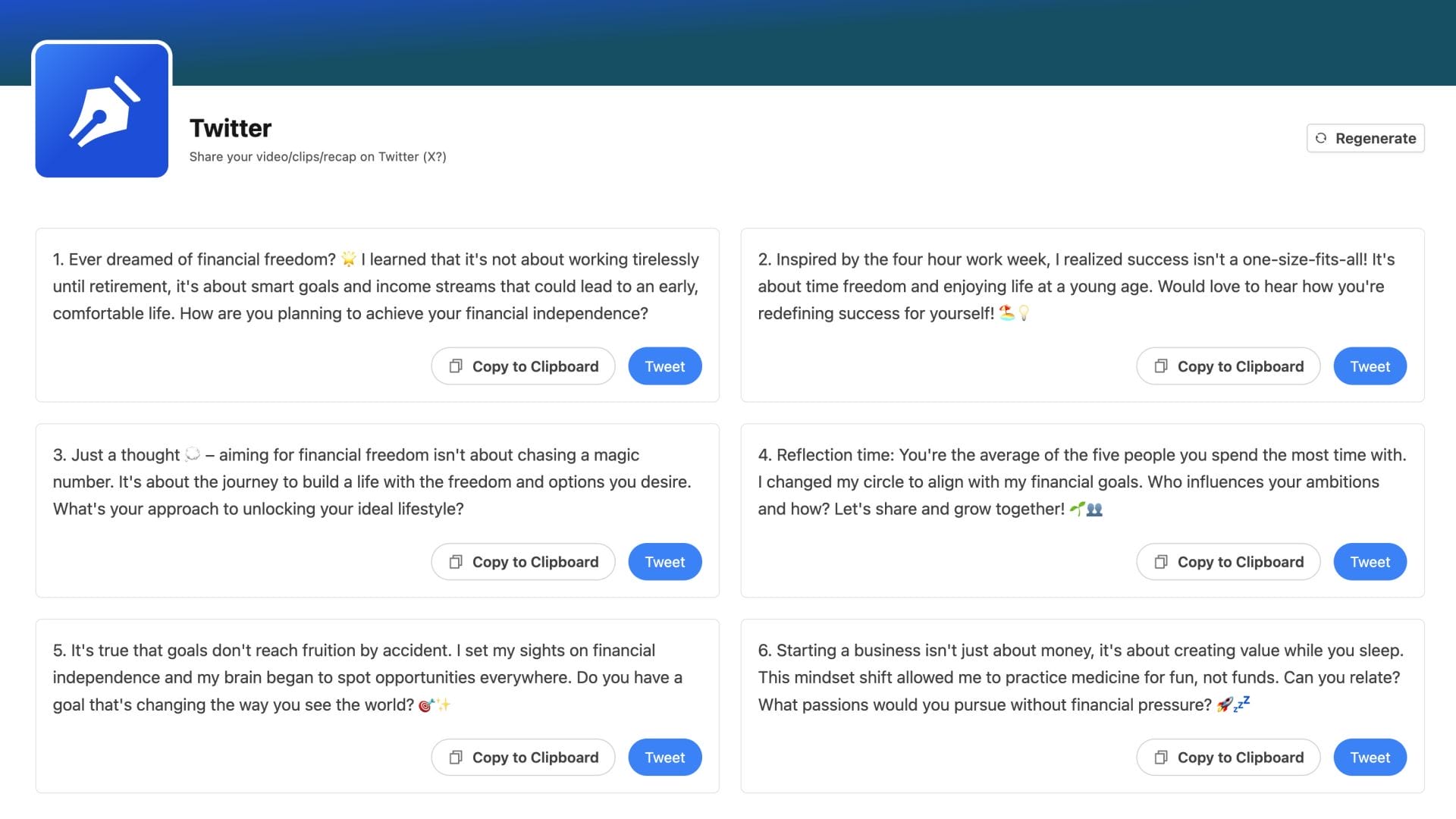Automatically convert your videos into shareable clips, social posts, and other written content