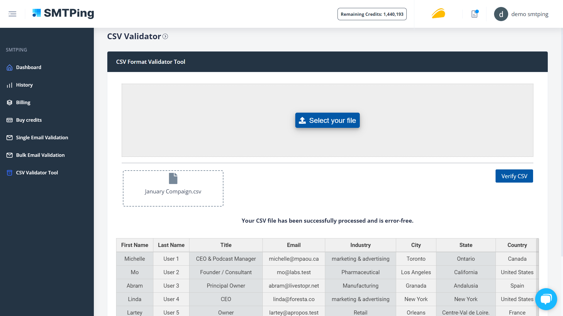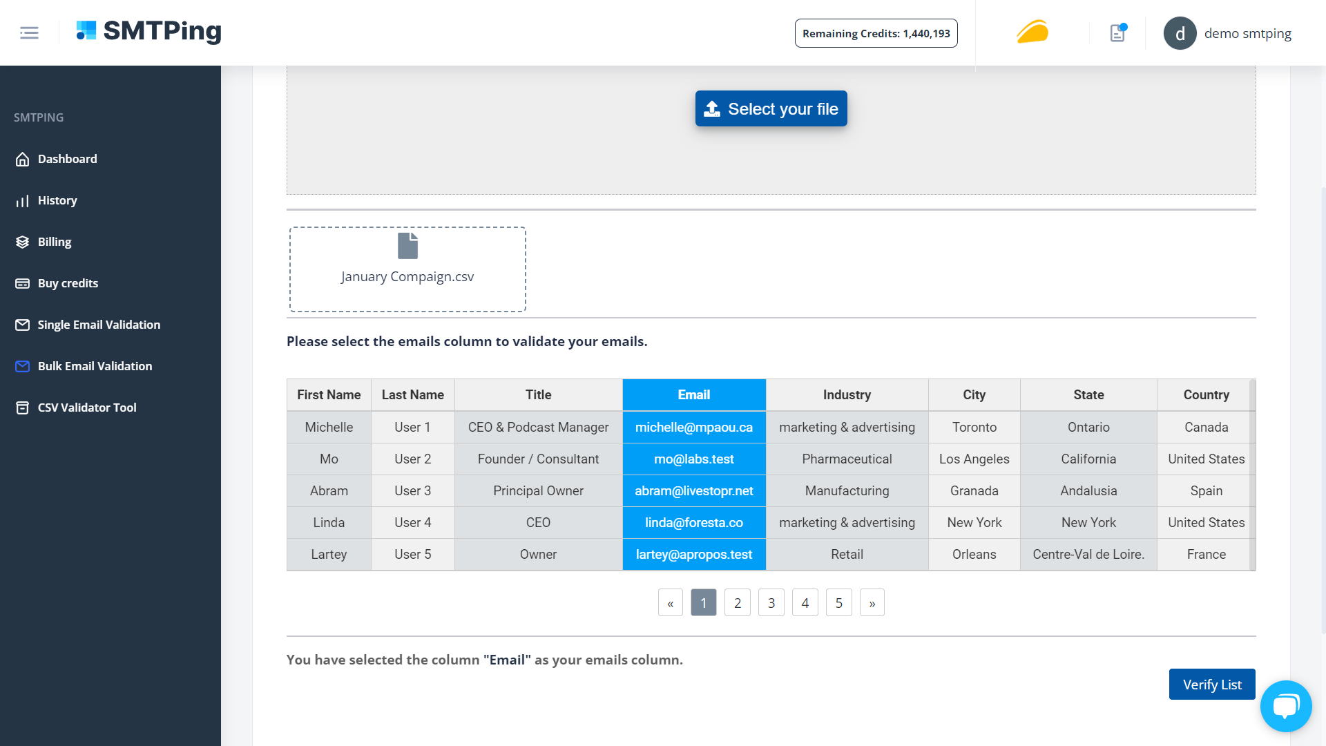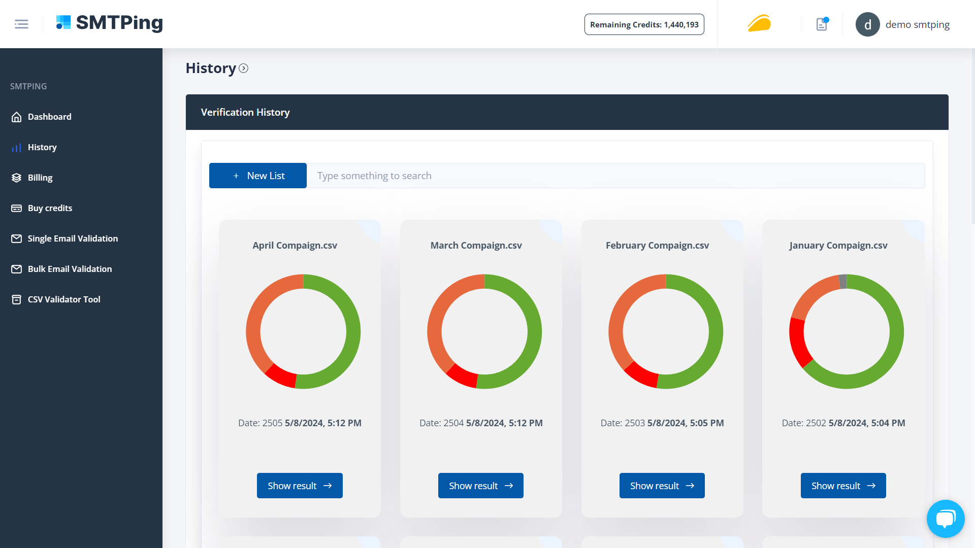 Monitor key metrics, access past validation results, and retrieve clean lists for new campaigns