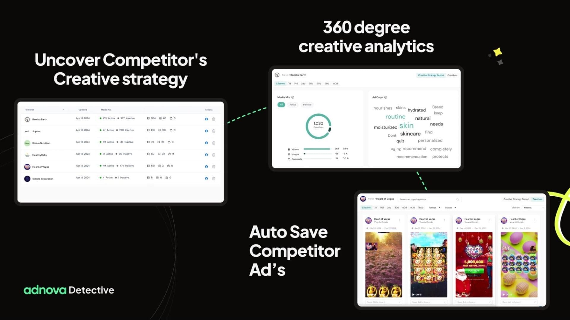 Adnova helps you find ad inspiration and track your competitors’ strategies to create winning creatives in record time.