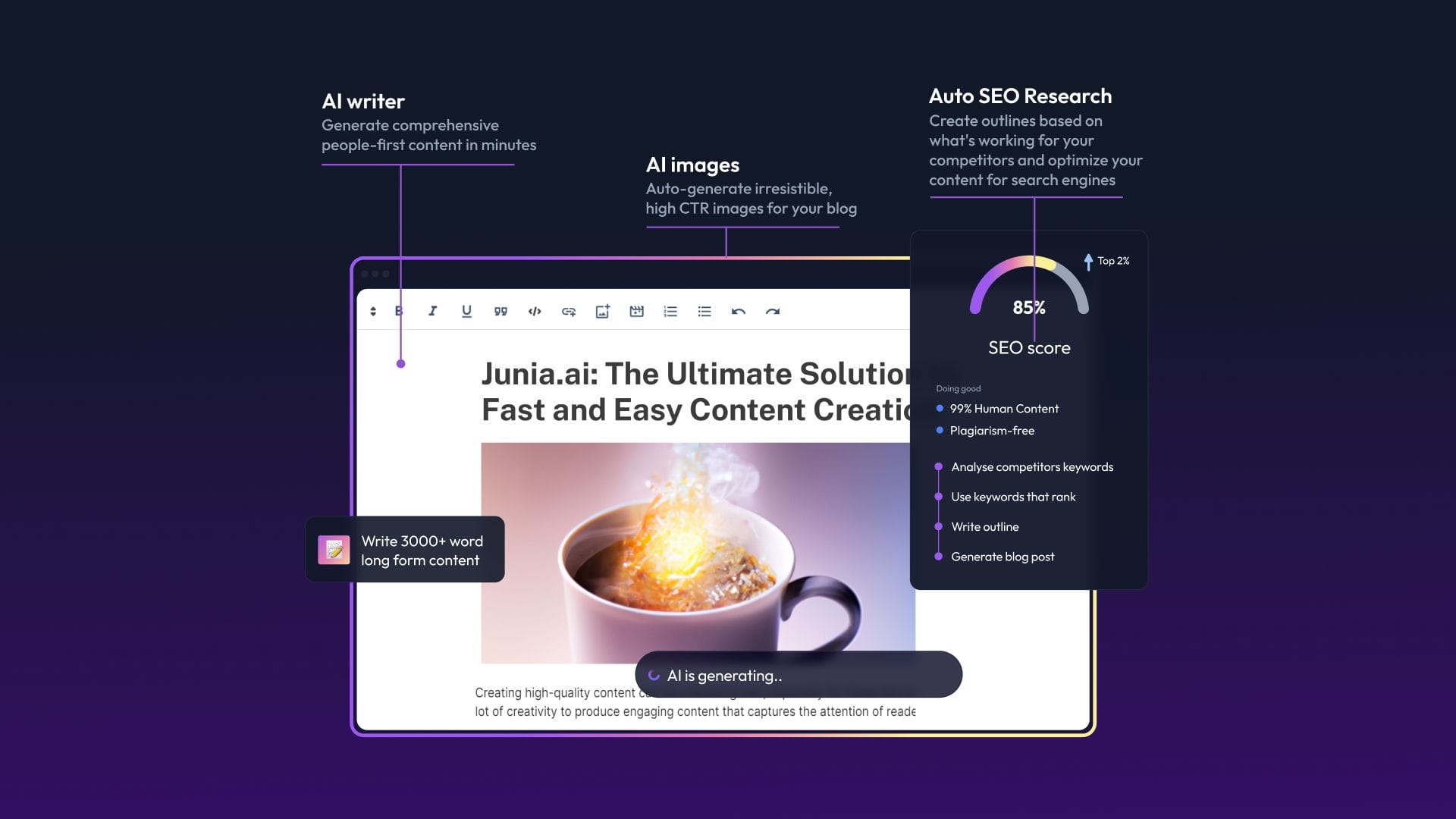 Junia AI is an AI writing tool that helps you create SEO-optimized long-form content to optimize your overall writing process.
