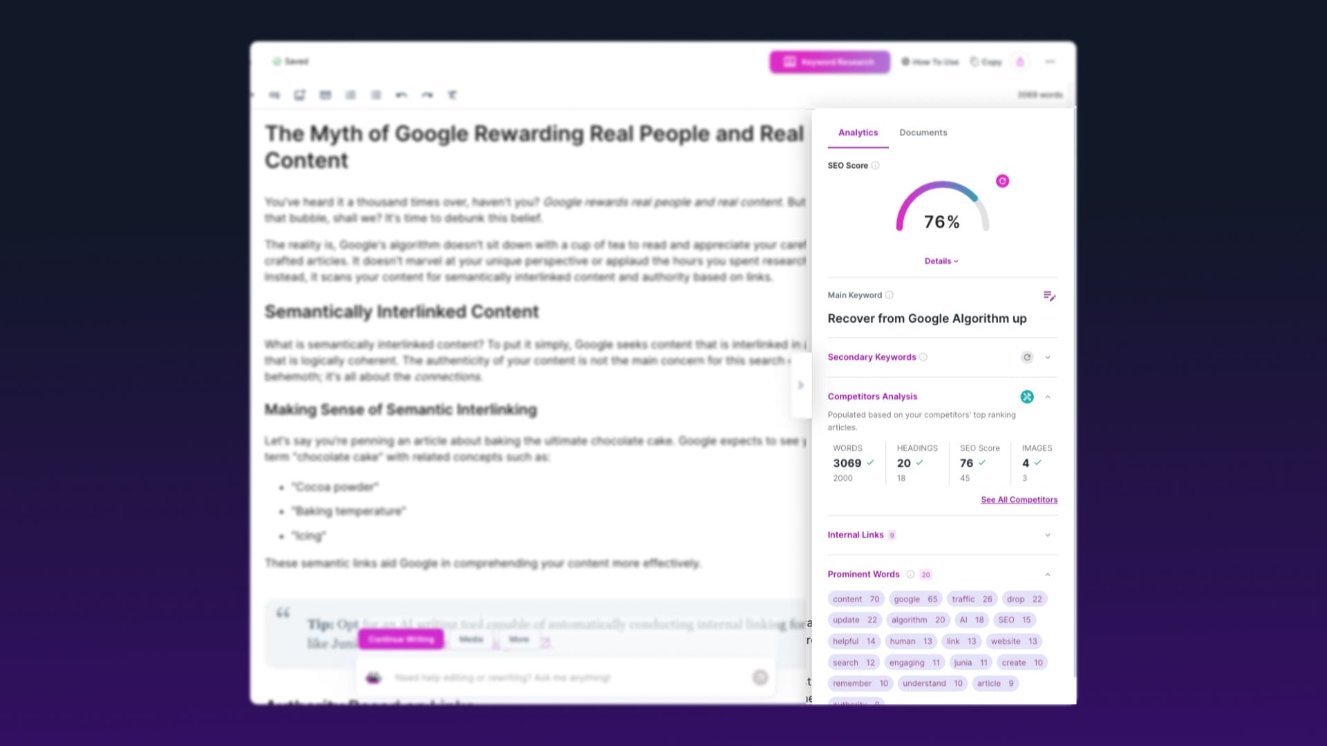 Get insights into keywords, links, competitors, and more with a suite of AI-powered research tools