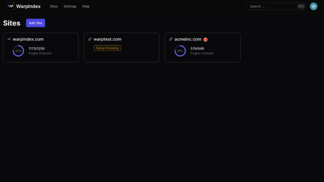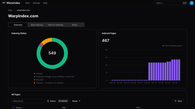 Track the overall status for every domain that you’re indexing with WarpIndex.