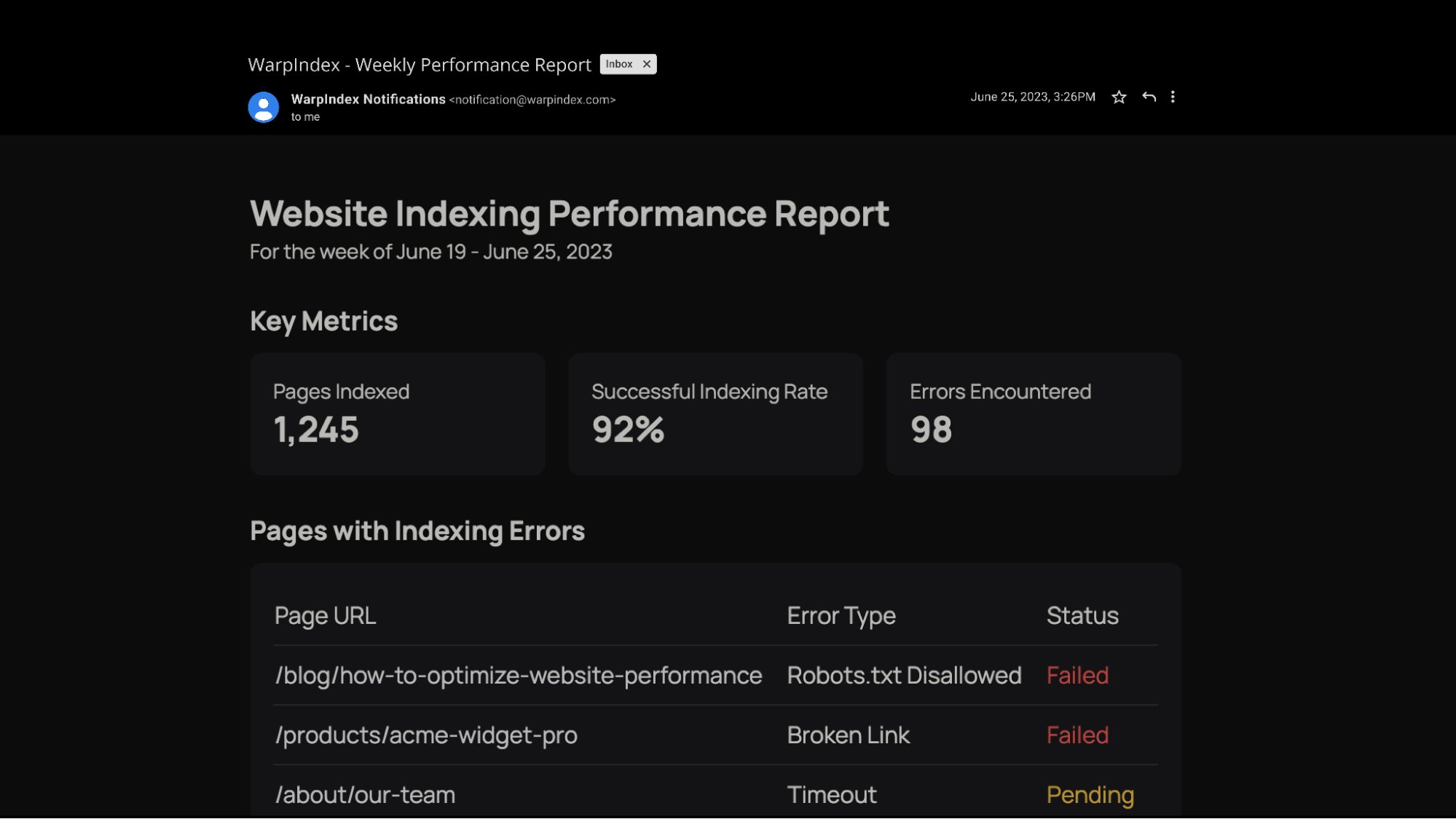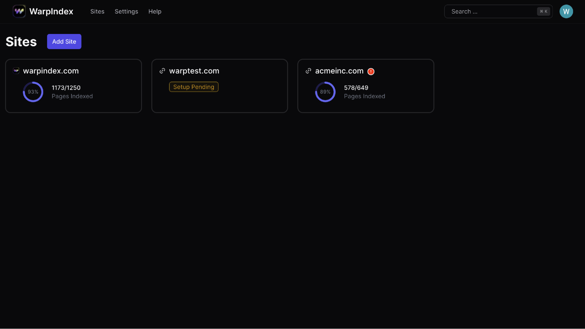 Track the overall status for every domain that you’re indexing with WarpIndex.