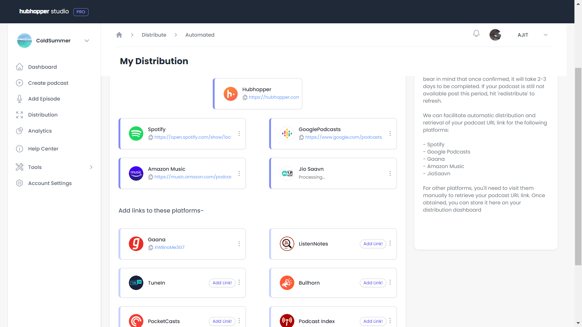 Hubhopper lets you distribute your podcast across global listening platforms like JioSaavn, Spotify, Gaana, and Amazon Music with just one click.