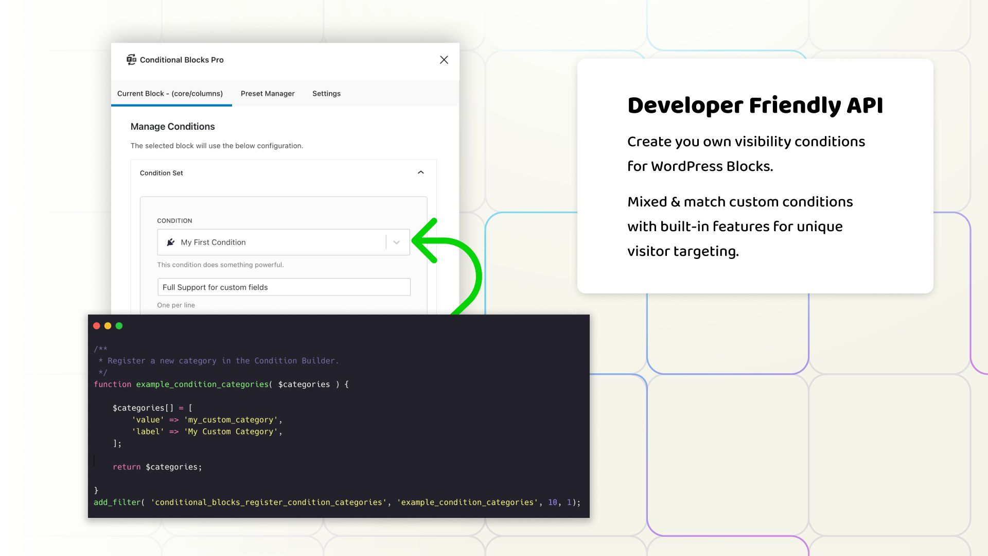 You can even create your own conditions for any WordPress block with the custom conditions API—and pair your rules with existing features and logic.