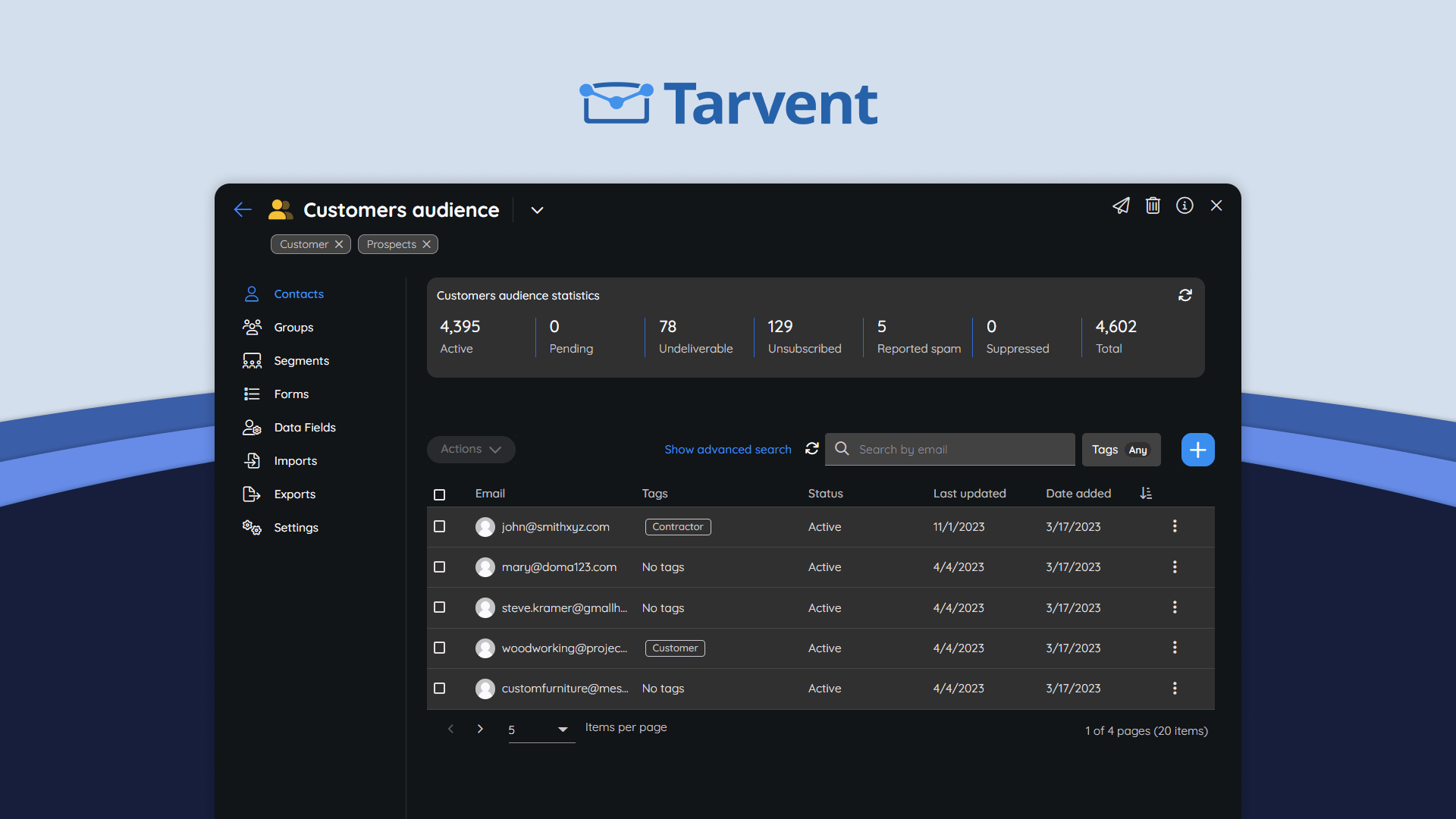 With Tarvent, you can easily manage contacts, data fields, segments, and more—all from a single location.