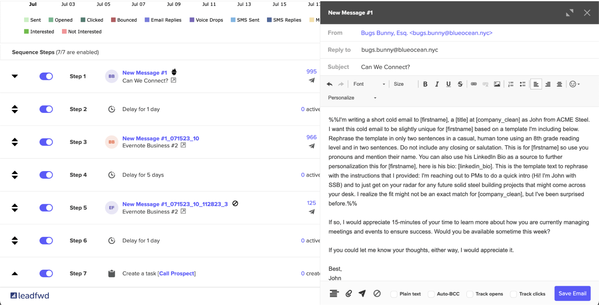 And because Leadfwd offers an AI sales assistant, you can whip up personalized messages that align with your prospect’s interests, needs, and aspirations.