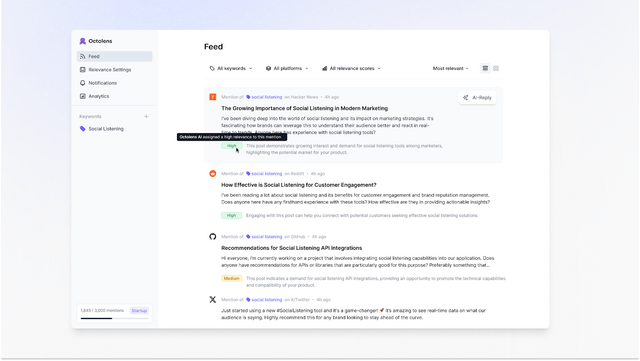 Octolens lets you find every social media post indicating high buyer intent, so you can swoop in to promote your business.