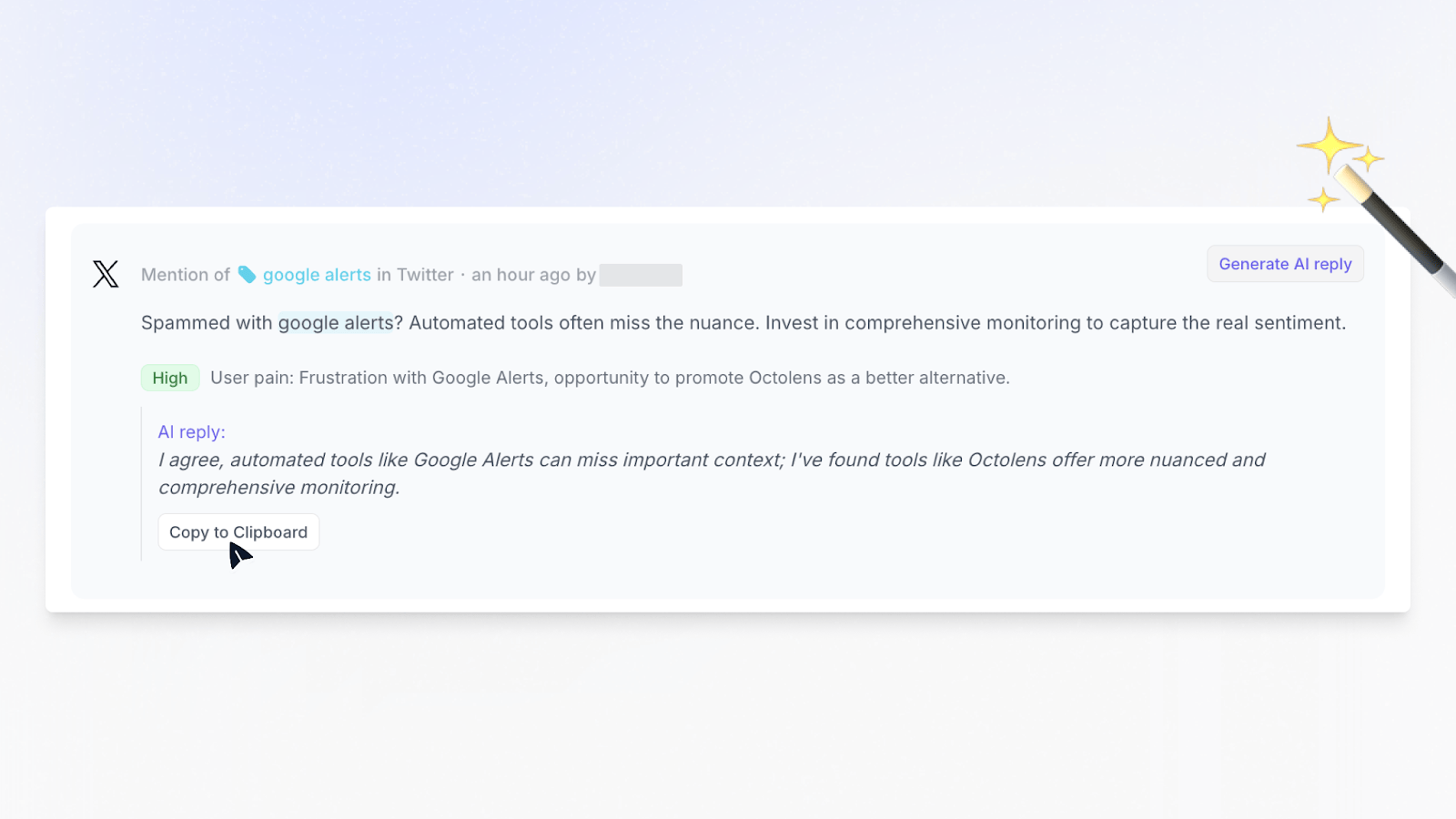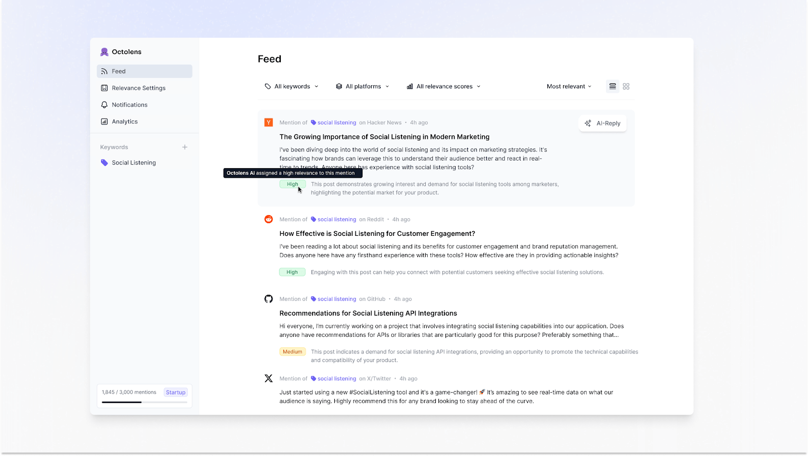Octolens lets you find every social media post indicating high buyer intent, so you can swoop in to promote your business.