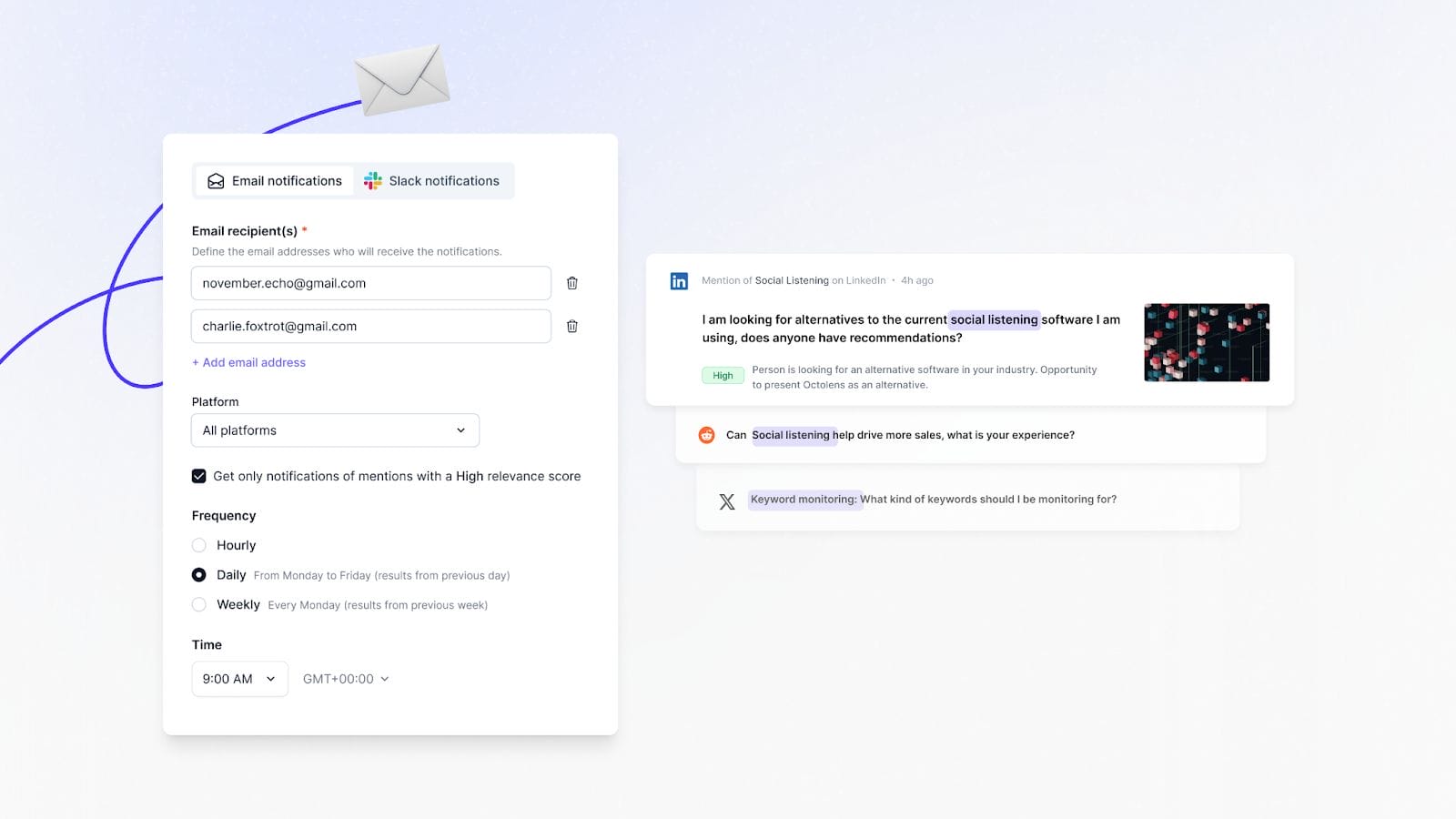 Get notified via Slack or email about AI-vetted posts that indicate high buyer intent