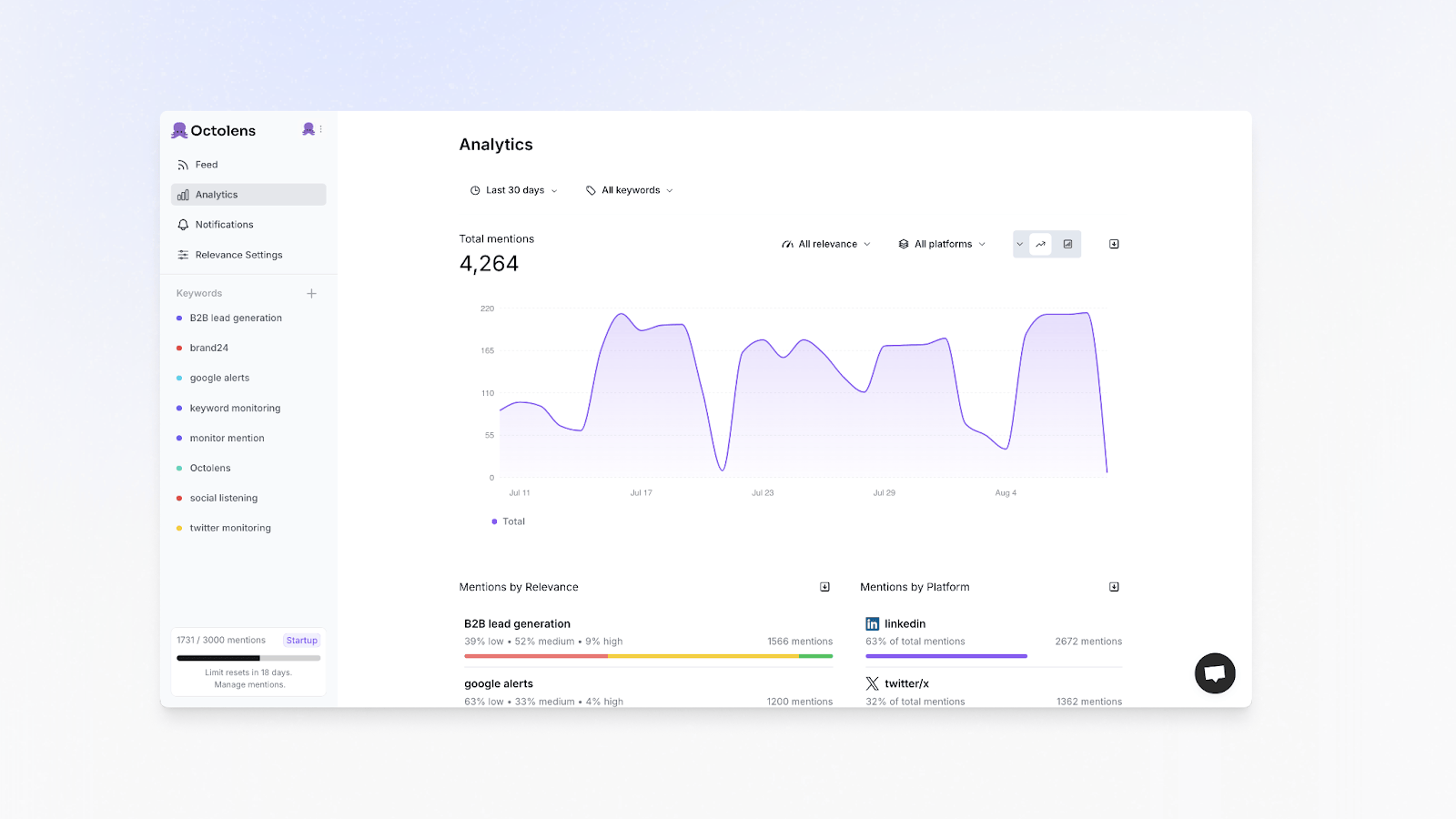 Octolens monitors target keywords on social media and notifies you of any mentions.