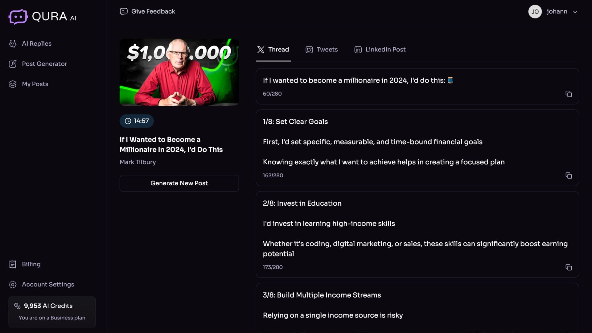 Not everyone wants to sit through a long YouTube video, which is why Qura generates bite-sized posts for X using your video content.