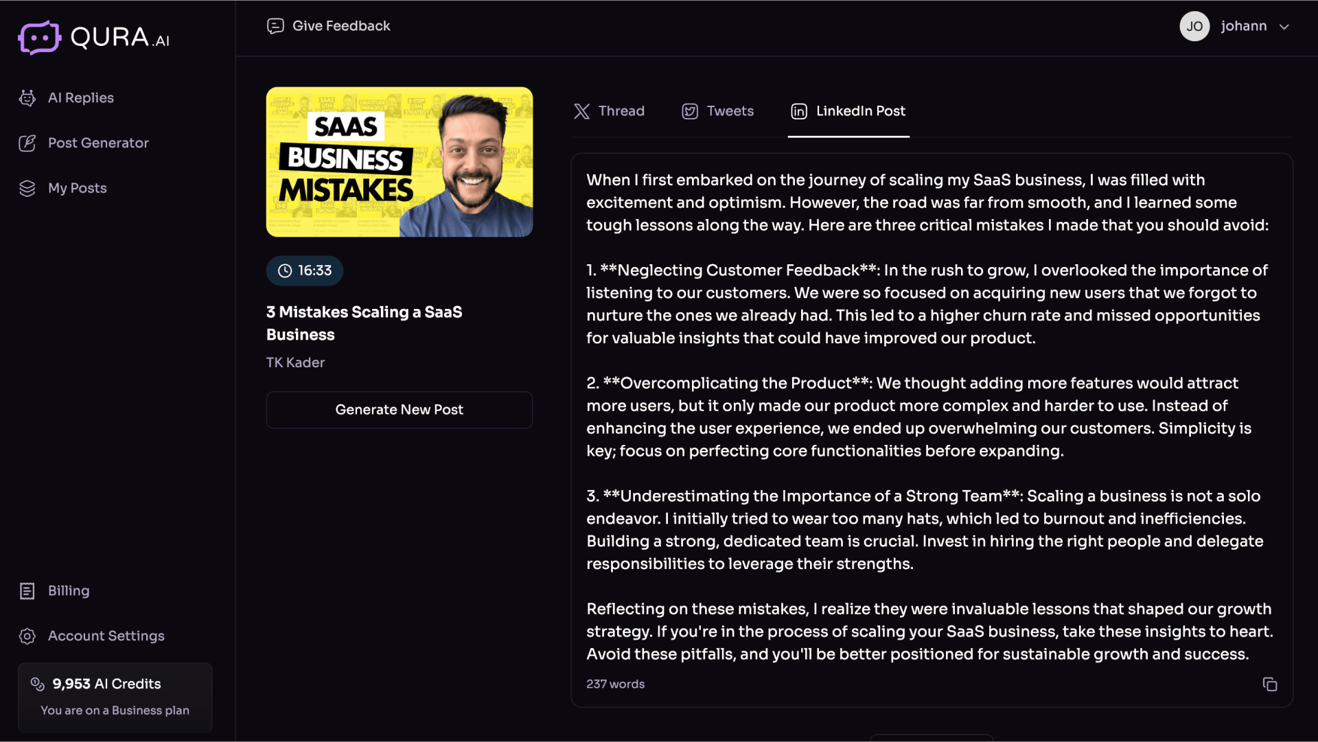 Qura makes it easy to engage more people by repurposing YouTube videos into X and LinkedIn content, along with AI-generated replies.