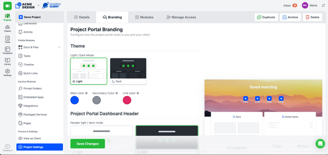 Impress clients with customizable project portals that match their logo, colors, images, and fonts