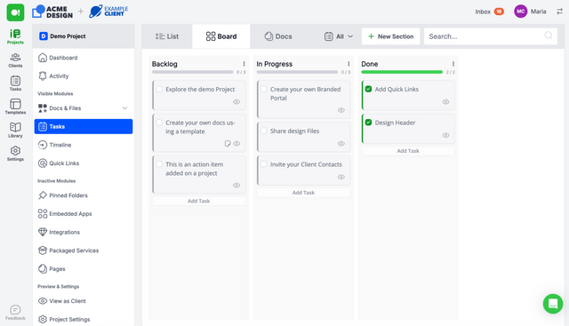 Customize a robust client portal for sharing documents, content, tasks, links, and embedded apps with your client